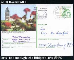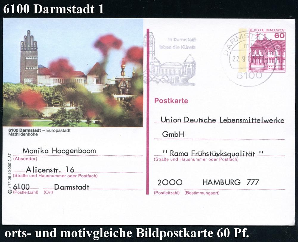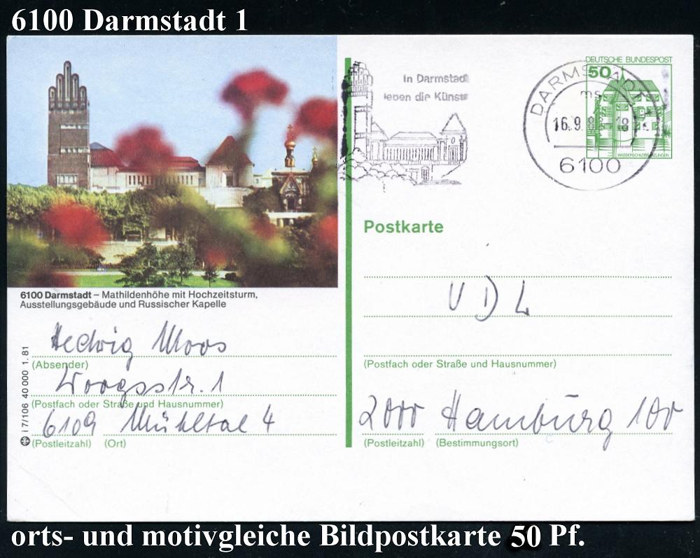 1110 | 12 € | 6100 Darmstadt Maschinen- und Serienstempel : 6100 DARMSTADT 1/ mt/ In Darmstadt/ leben die Künste 19871 (22.9.) MWSt = Mathildenhöhe auf Orts- u. motivgl. BiP 60 Pf. Burgen: Mathildenhöhe.. , Bedarf!, seltene Kombination! (Mi.P 138) | ![]() | |