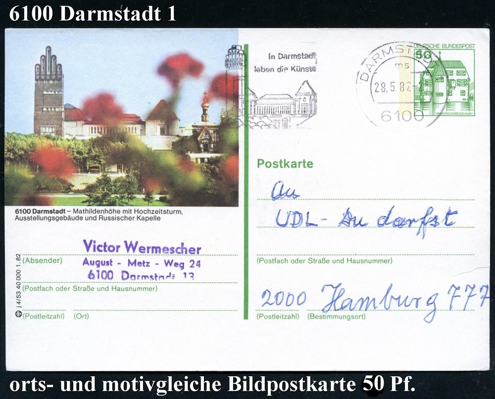 1109 | 25 € | 6100 Darmstadt Maschinen- und Serienstempel : 6100 DARMSTADT 1/ ms/ In Darmstadt/ leben die Künste 1982 MWSt = Mathildenhöhe je auf orts- u. motivgl. BiP 50 Pf. Burgen, grün: Mathildenhöhe.. (Mi.P 134/i 7-106 bzw. j 4/53) Bedarf! (Einzelverkauf möglich: je 14.- EUR) 2 Belege | ![]() ![]() | |