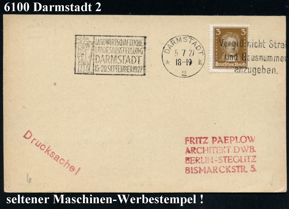1088 | 25 € | 6100 Darmstadt Maschinen- und Serienstempel : DARMSTADT/ *2k/ LANDWIRTSCHAFTL/ LANDESAUSSTELLUNG../ Vergiß nicht Straße/ u.Hausnummer.. 1927 (5.7.) seltener MWSt (Bauer mit Sense) 2 Texte! (rechts nicht ganz voll) klar gest. Inl.-Drs.-Karte (Bo.8 E S 70) | ![]() | |
