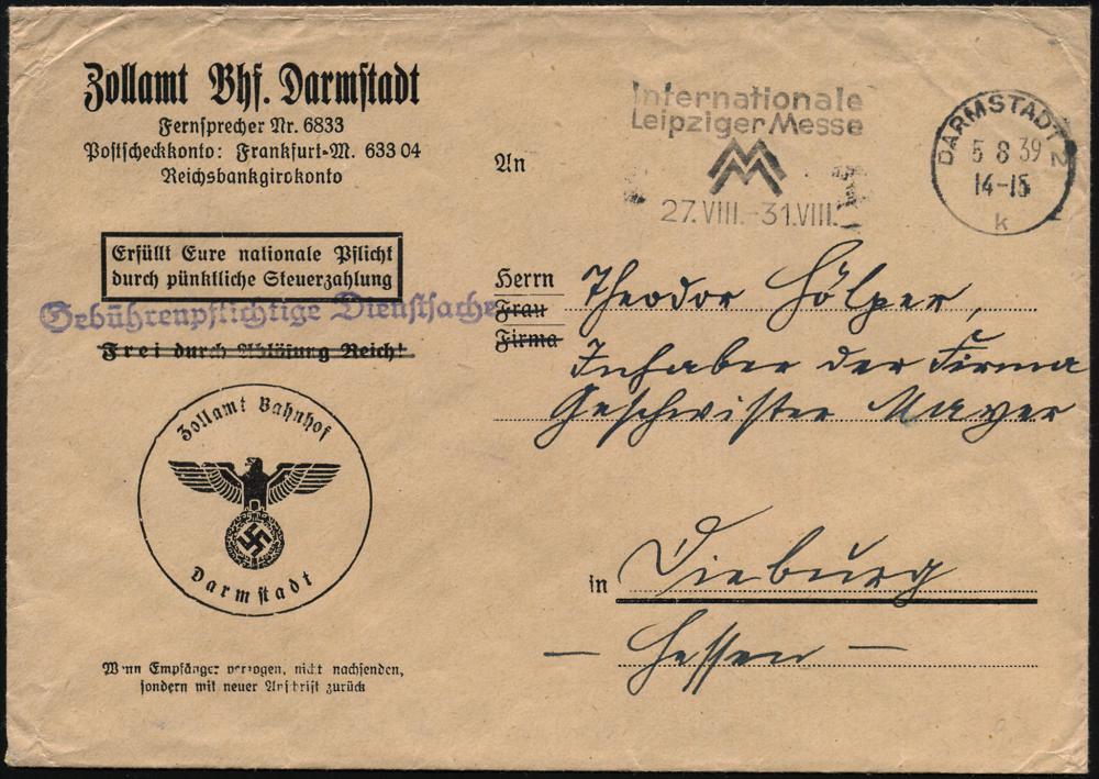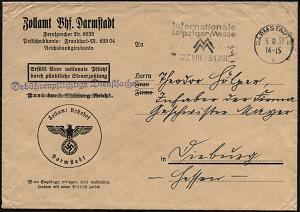 1094 | 18 € | 6100 Darmstadt Maschinen- und Serienstempel : DARMSTADT 2/ k/ Int./ Leipziger Messe/ MM/ 27.VIII.-31.VIII. 1939 (5.8.) MWSt auf markenlosem Dienstbf.: Zollamt Bhf Darmstadt + 1L: Gebührenpflichtige Dienstsache (FdAR gestrichen) ohne Nachgebühr n. Dieburg (Bo.S 328 A ,nur 1 1/2 Monate verwendet) | ![]() | |