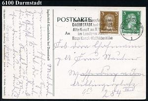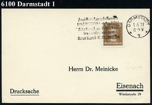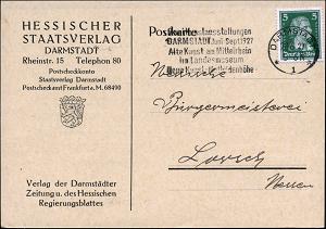 1084 | 20 € | 6100 Darmstadt Maschinen- und Serienstempel : DARMSTADT/ *1*/ Zwei Kunstausstellungen/ ..Alte Kunst am Mittelrhein/ ..Neue Kunst Mathildenhöhe 1927 (28.6.) seltener MWSt klar auf Dienst-Kt.: Hess. Staatsverlag.. (Wappen) n. Lorsch (Bo.9 A) | ![]() ![]() | |