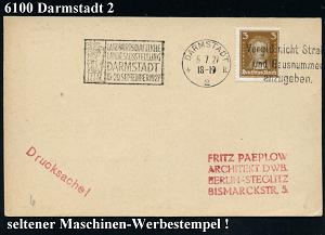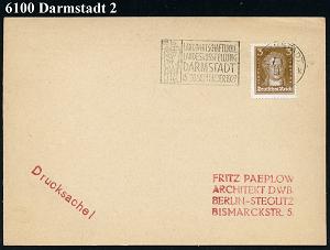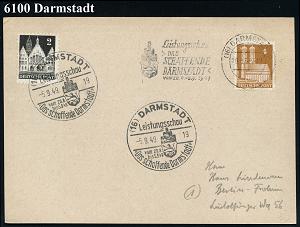 1104 | 14 € | 6100 Darmstadt Maschinen- und Serienstempel : (16) DARMSTADT 2/ a/ Leistungsschau/ "DAS/ SCHAFFENDE/ DARMSTADT".. 1949 (20.8./5.9.) MWSt + motivgleicher SSt 2x auf Bauten-Frankatur, Inl.-Drs.-Karte (Bo.30 A + 31) | ![]() | |