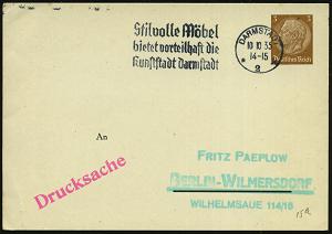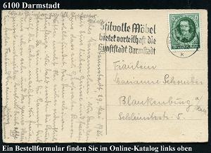 1090 | 18 € | 6100 Darmstadt Maschinen- und Serienstempel : DARMSTADT/ *2k/ Stilvolle Möbel/ bietet vorteilhaft die/ Kunststadt Darmstadt 1935 (10.10.) MWSt auf PP 3 Pf. Hindenbg. (Paeplow, Mi.PP 122/A 3 = blanco) Inl.-Karte (Bo.15 A I , nur 1935-36 verwendet!) | ![]() | |