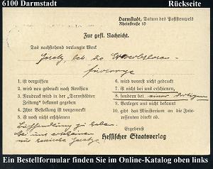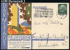 1093 | 25 € | 6100 Darmstadt Maschinen- und Serienstempel : DARMSTADT 2/ k/ Erste Großdeutsche/ Schwimmeisterschaften/ 8.-10.Juli 1938 (12.6.) MWSt auf Color-Künstler-Ak.: DIE HESSISCHE LNDESHAUPTSTADT; Ob.-Reg.-Rat Dr. Bernheim, Schriftleitung der Corpszeitung "Austria" K.S.C., Bedarf (Bo.18 A) | ![]() | |
