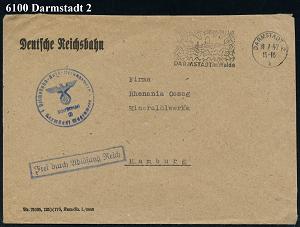 1100 | 18 € | 6100 Darmstadt Maschinen- und Serienstempel : DARMSTADT 2/ k/ DARMSTADT im Walde 1942 (30.7.) MWSt Type I mit Orts-1K-Stpl. (Waldblick auf Darmstadt) + HdN (FdAR): Reichsbahn-Ausbesserungswerk, Reichsbahn-Dienstbf. (Bo.29 A I = seltenere Type!) | ![]() | |