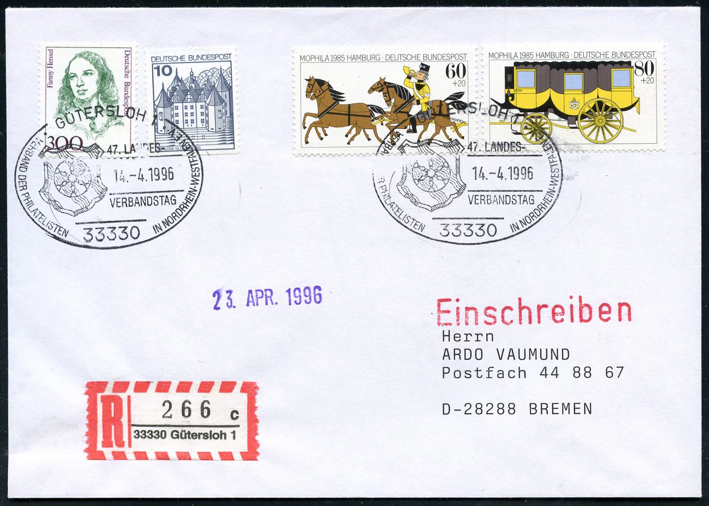 8659 | 14 € | PL-Raum 48.. (ohne Bielefeld) : 33330 GÜTERSLOH 1/ 47.LANDES-/ VERBANDSTAG/ ..PHILATELISTEN NORDRHEIN-WESTFALEN 1996 (14.4.) SSt auf "Mophila" 60+20 Pf. u. 90+20 Pf. u.a. (Stadtwappen) 2x + RZ: 33330 Gütersloh 1/c (Mi.1255/56 u.a.) | ![]() | |