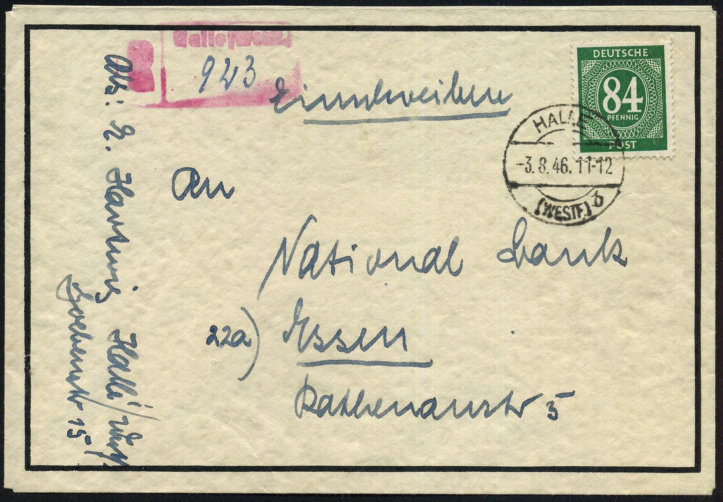 8661 | 20 € | PL-Raum 48.. (ohne Bielefeld) : HALLE/ (WESTF)/ b 1946 (3.8.) 1K-Brücke auf EF 84 Pf. Ziffer + rotviol. R - S t e m p e l : Halle (Westf) + hs. R-Nf. (abgenutzt) Trauer-R-Bf., seltene Verwendung (Mi.936 EF + 8.- EUR) | ![]() | |