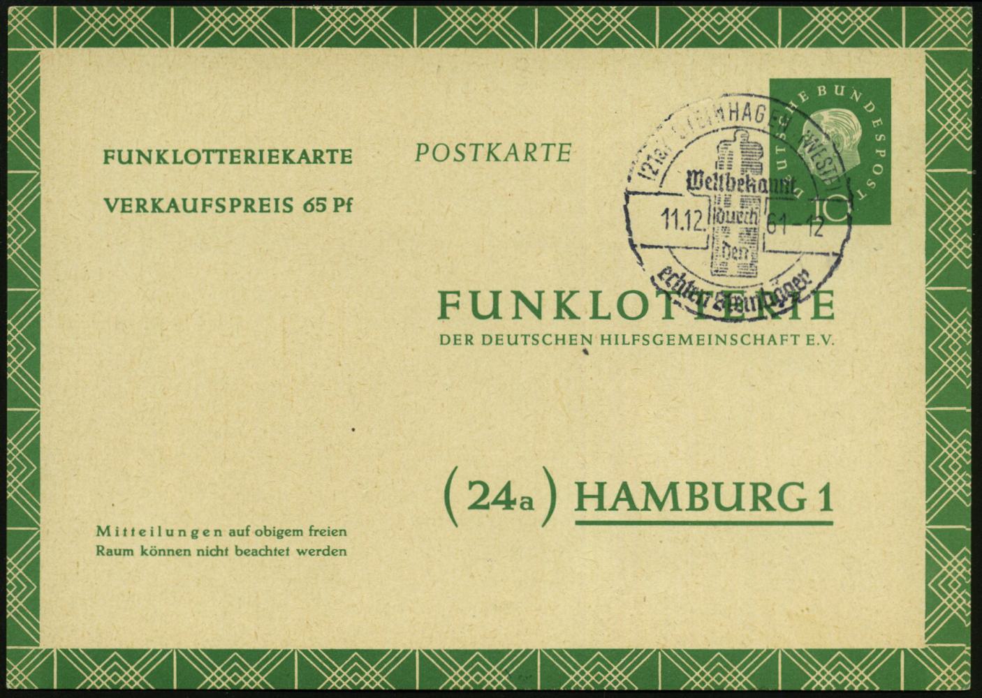 8677 | 16 € | PL-Raum 48.. (ohne Bielefeld) : (21a) STEINHAGEN (WESTF)/ Weltbekannt/ durch/ den/ echten Steinhäger 1961 (11.12.) HWSt = Steinhäger-Keramikflasche auf Funklotterie-FP 10 Pf. Heuss III (Mi.FP 7) Bedarf!, seltene Verwendung! (Bo.2) | ![]() ![]() | |