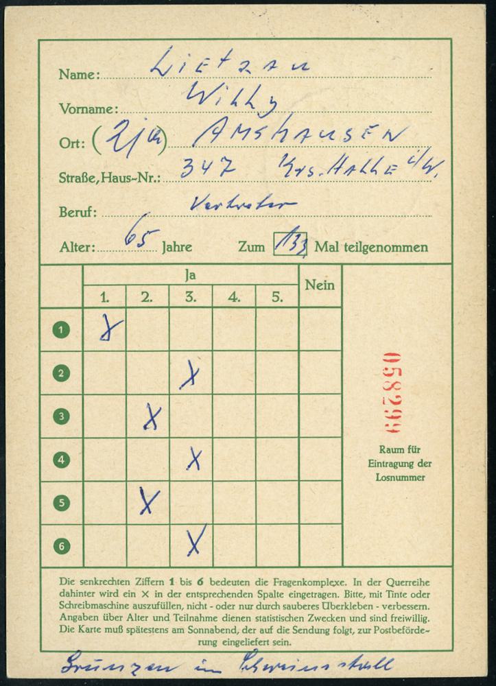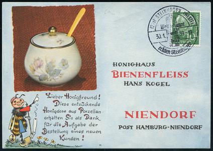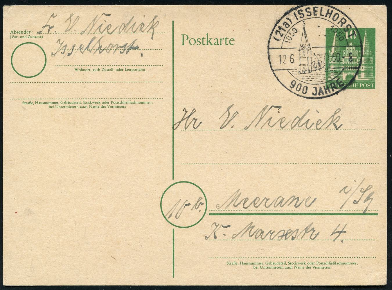 8664 | 20 € | PL-Raum 48.. (ohne Bielefeld) : (21a) ISSELHOST/ 1050-1950/ 900 JAHRE 1950 (12.6.) HWSt (Kirchturm) auf Inl.-P 10 Pf. Holstentor, notopferbefreite Inl.-Karte in die DDR, Bedarf! (Bo.1, nur 1950 bis Anfang 1951 verwendet) | ![]() | |