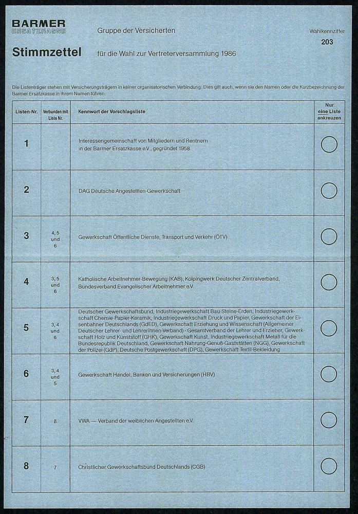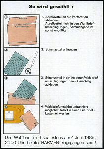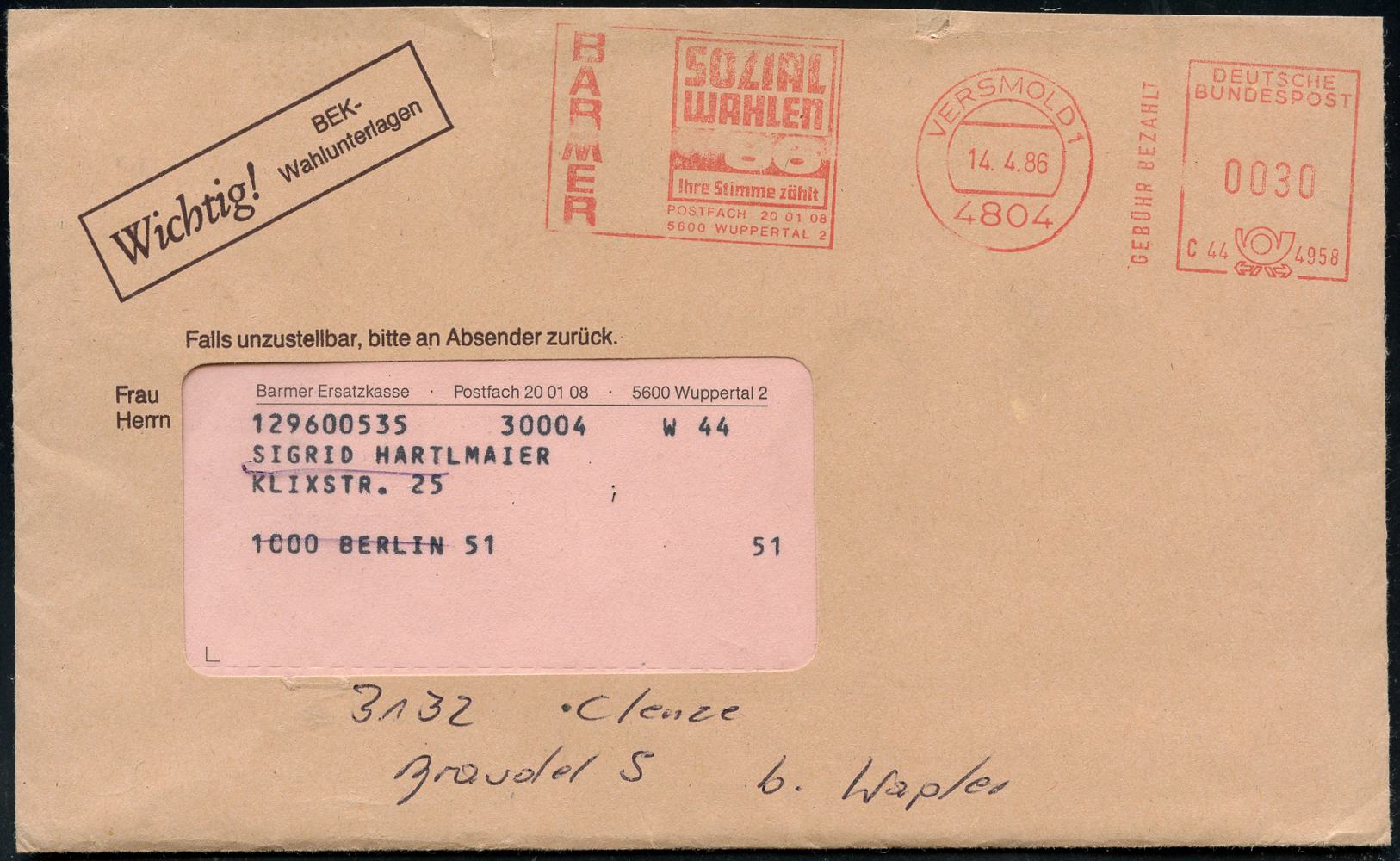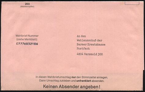 8684 | 20 € | PL-Raum 48.. (ohne Bielefeld) : 4804 VERSMOLD 1/ GEBÜHR BEZAHLT/ BARMER/ SOZIAL/ WAHLEN.. 1986 (14.4.) AFS auf Wahlbf. (oben kl. Öffnungsmäng.) + Inhalt: portofreier rosa Wahlbrief + Wahlmerkblatt + Stimzettel , 4 Belege komplett!, selten! | ![]() ![]() ![]() ![]() | |