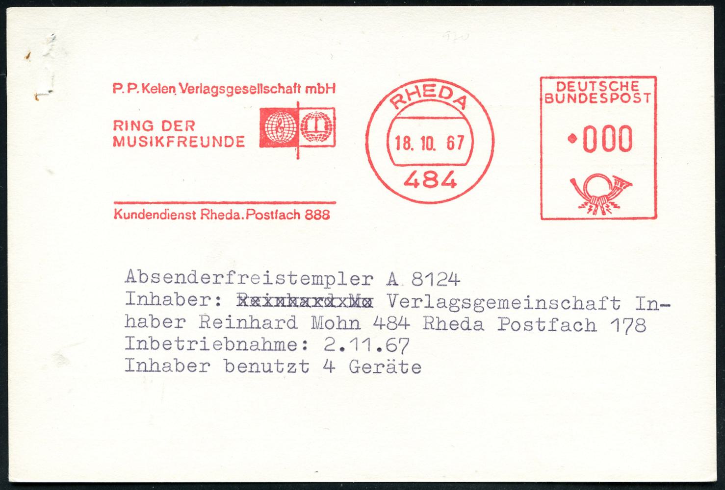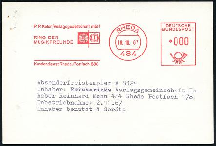 8672 | 18 € | PL-Raum 48.. (ohne Bielefeld) : 484 RHEDA/ P.P.Kelen Verlagsges.mbH/ RING DER/ MUSIKFREUNDE.. 1967 (18.10.) AFS Francotyp "Posthorn" in 000 (Notenschlüssel, Buch vor Globus) OPD-Archiv-Kt. (kl. Klammerspur) mit posttechen. Daten = Fa. Mohn-Bertelsmann, seltenes Archiv-Unikat! (Dü.E-26) | ![]() | |