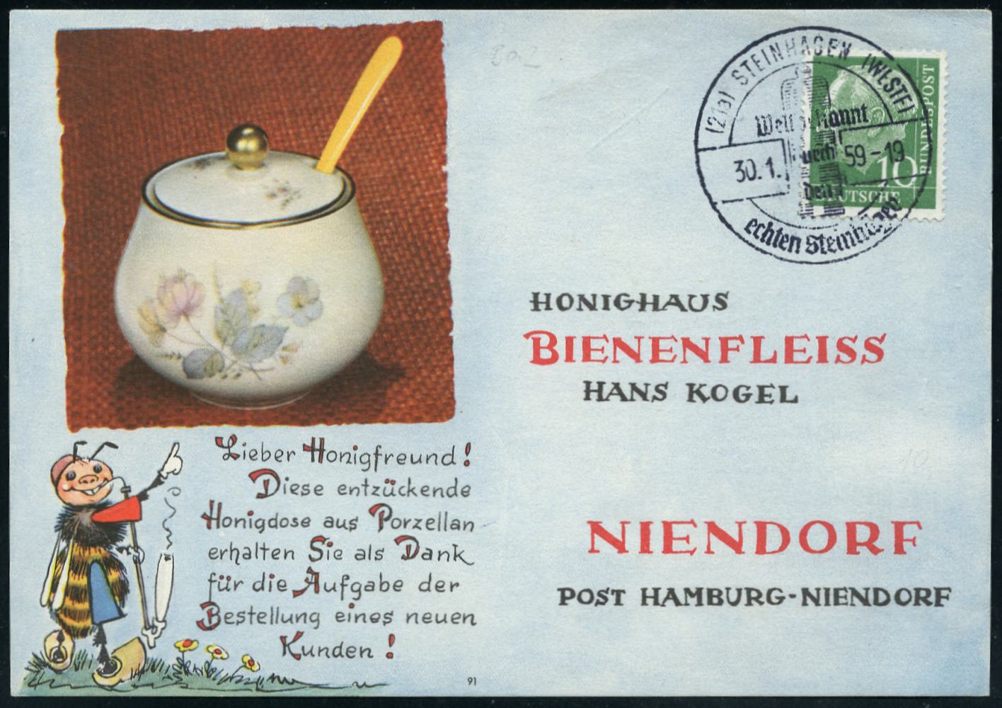 8676 | 12 € | PL-Raum 48.. (ohne Bielefeld) : (21a) STEINHAGEN (WESTF)/ Weltbekannt/ durch/ den/ echten Steinhäger 1959 (30.1.) HWSt = Steinhäger-Flasche , Firmen-Antwort-Kt. (Bo.2) | ![]() | |