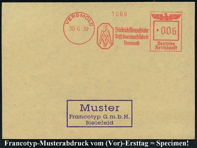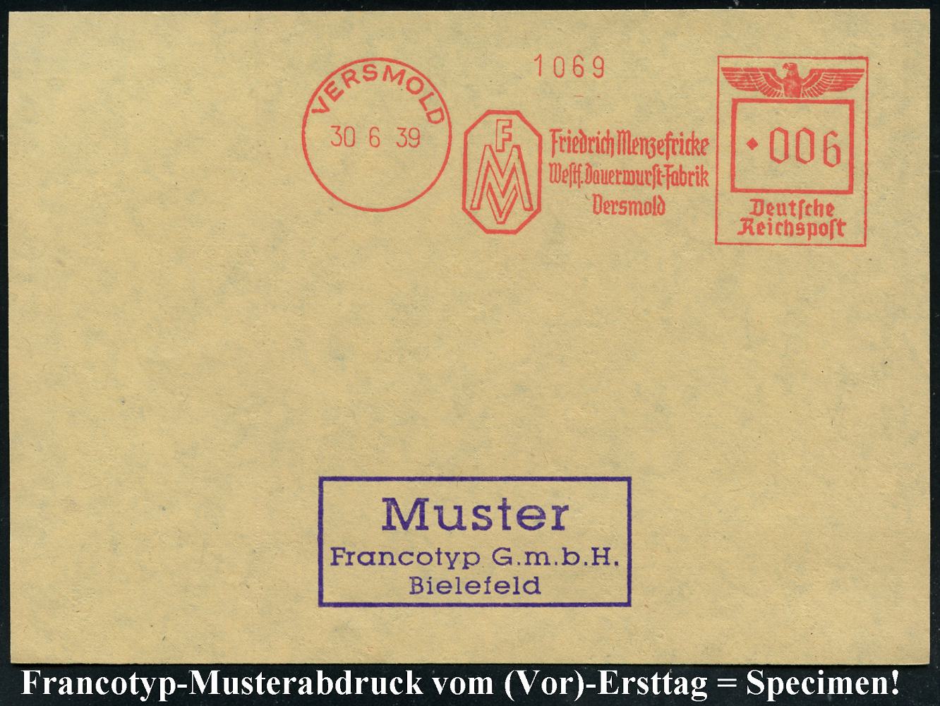 8681 | 35 € | PL-Raum 48.. (ohne Bielefeld) : VERSMOLD/ FMV/ Friedrich Menzefricke/ Westf.Dauerwurst-Fabrik.. 1939 (30.6.) AFS-Musterabdruck Francotyp "Reichsadler" (Monogr.-Loge) glasklar gest. Francotyp-Musterblatt vom (Vor)-Ersttag !, selten! (Dü.E-5DGh) | ![]() ![]() | |