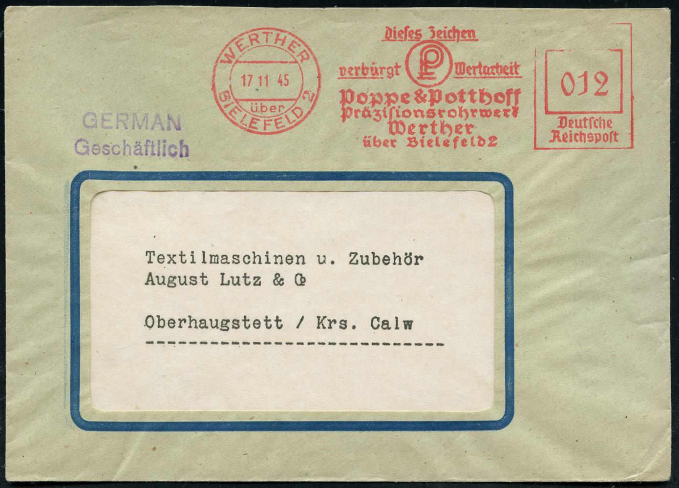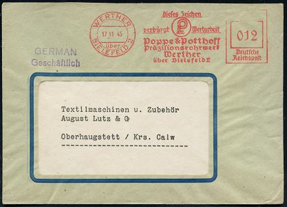 8685 | 25 € | PL-Raum 48.. (ohne Bielefeld) : WERTHER/ über/ BIELEFELD 2/ ..Poppe & Potthoff/ Präzisionsrohrwerk.. 1945 (17.11.) aptierter AFS Francotyp "Reichsadler" = entfernt = Notmaßnahme! (Monogr.-Logo) = PSt.I-Typ, Fern-Bf. (Dü.E-13 J-127o) | ![]() | |