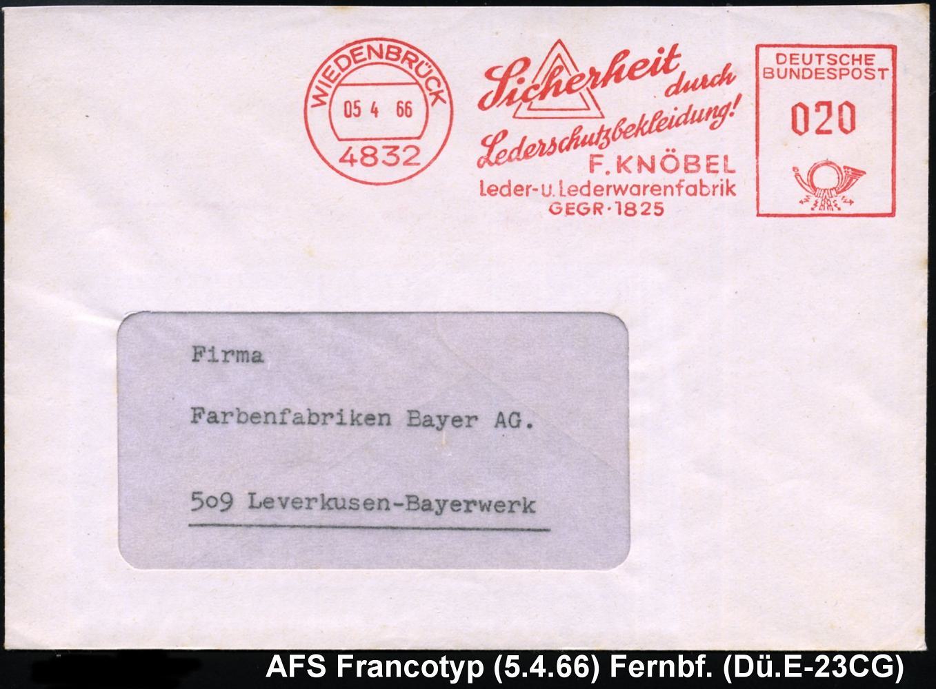 8687 | 14 € | PL-Raum 48.. (ohne Bielefeld) : 4832 WIEDENBRÜCK/ Sicherheit/ durch/ Lederschutzbekleidung/ F.KNÖBEL/ Leder-u.Lederwarenfabrik.. 1966 (5.4.) AFS Francotyp (Verkehrsschild) Fern-Bf. (Dü.E-23CG) | ![]() | |