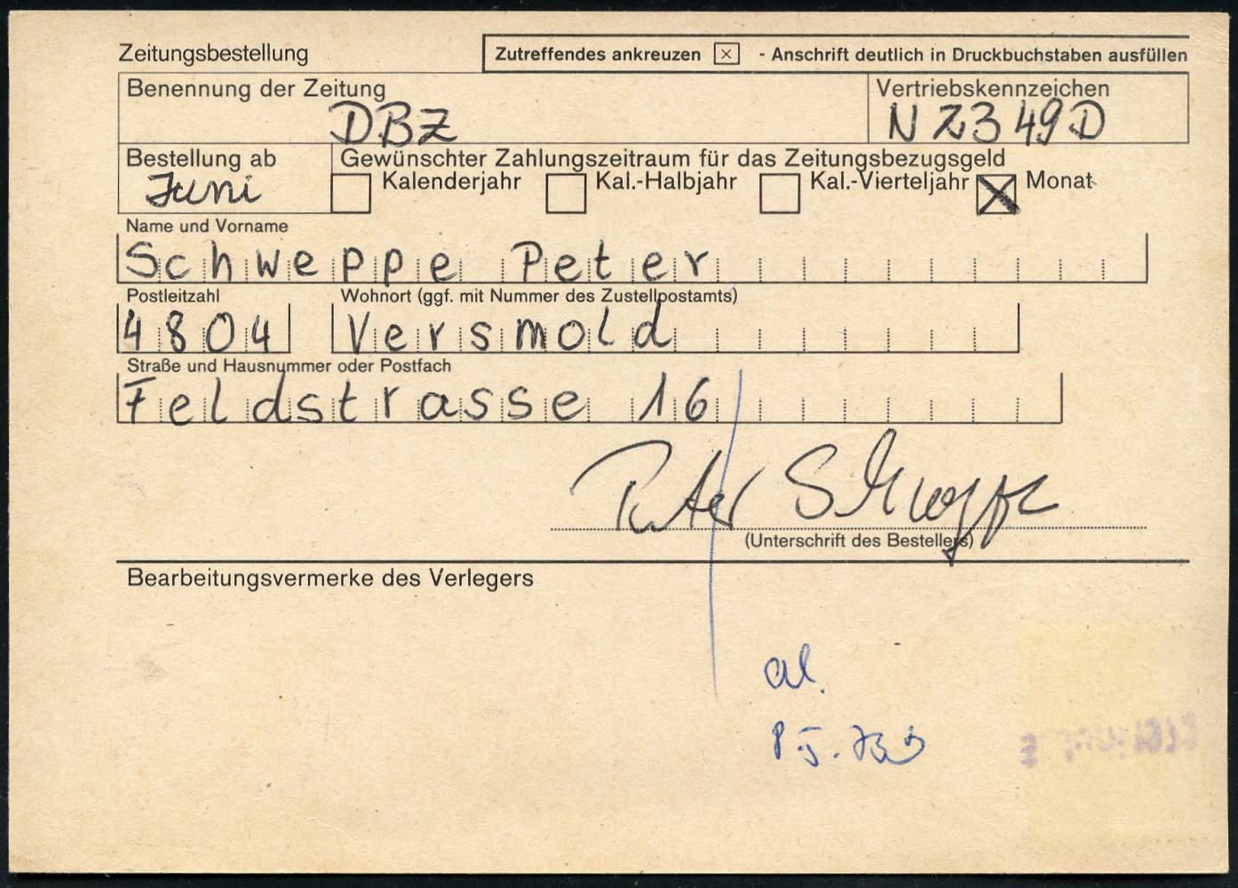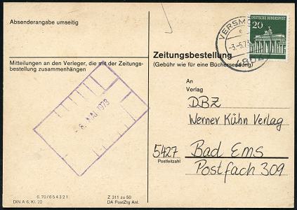 8682 | 18 € | PL-Raum 48.. (ohne Bielefeld) : 4804 VERSMOLD/ e 1973 (3.5.) 1K-Segment auf EF 20 Pf. Brandenbg.Tor auf "Zeitungsbestellung" = seltene Frankatur u. Verwendung! (dazu Info-Kopie), klar gest. Fern-Kt. n. Bad Ems (Mi.507 EF) | ![]() ![]() | |