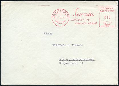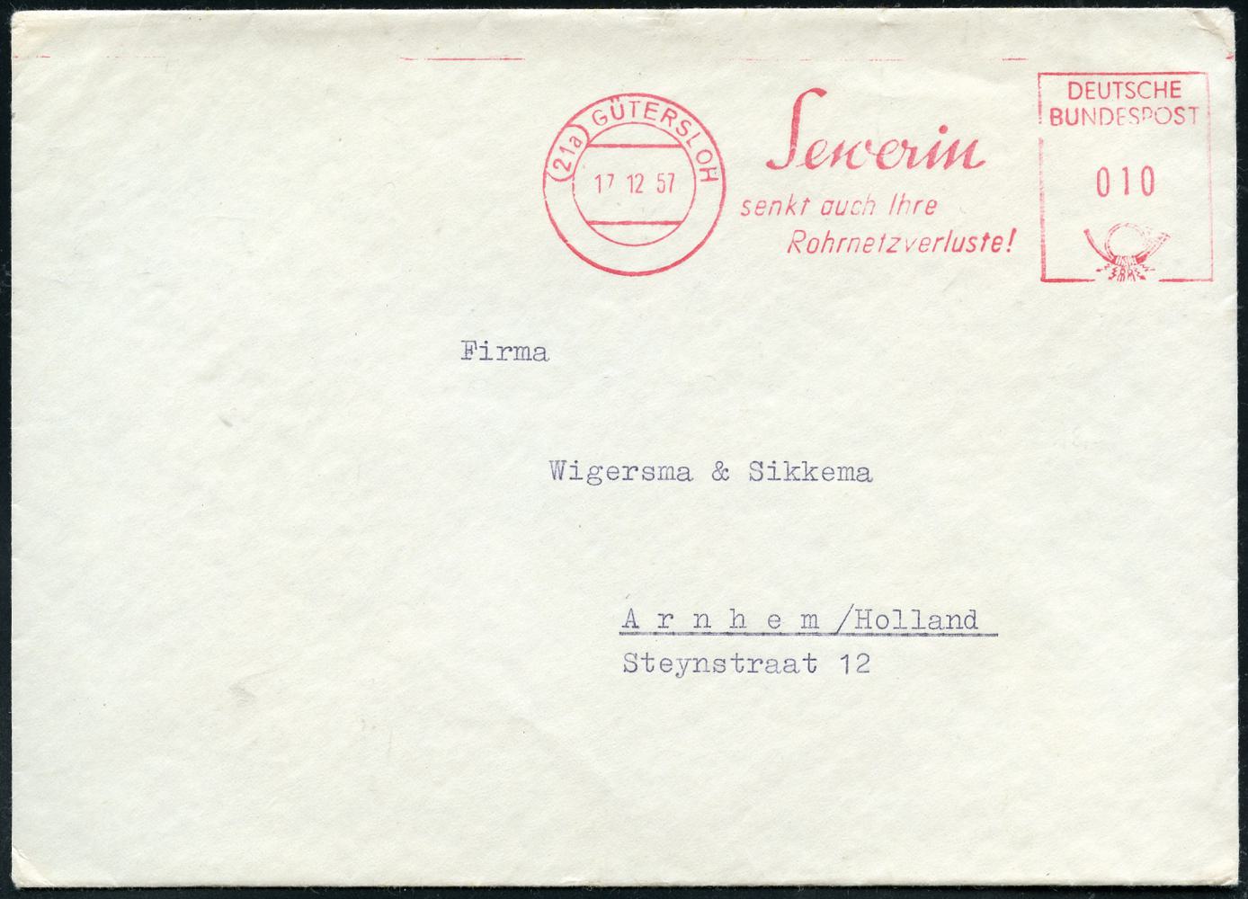 8641 | 16 € | PL-Raum 48.. (ohne Bielefeld) : (21a) GÜTERSLOH/ Severin/ senkt auch Ihre/ Rohrnetzverluste! 1957 (17.12.) AFS Postalia "Posthorn" (= Gas-, Wasser-Leck-Suchdienst) klar gest. Ausl.-Bf. (Dü.E-23 B) | ![]() ![]() | |