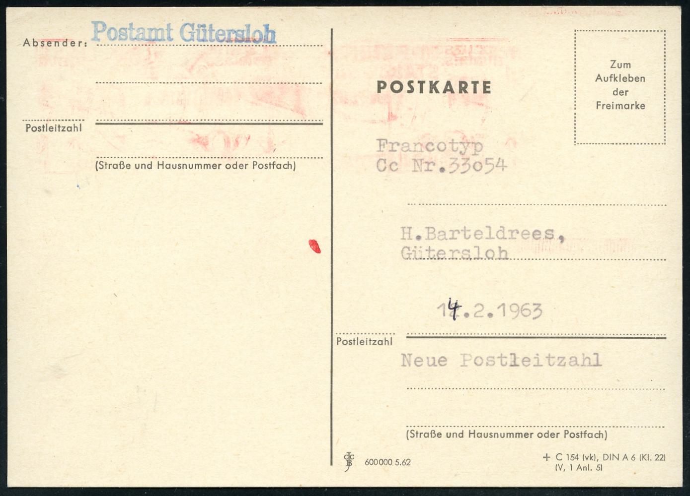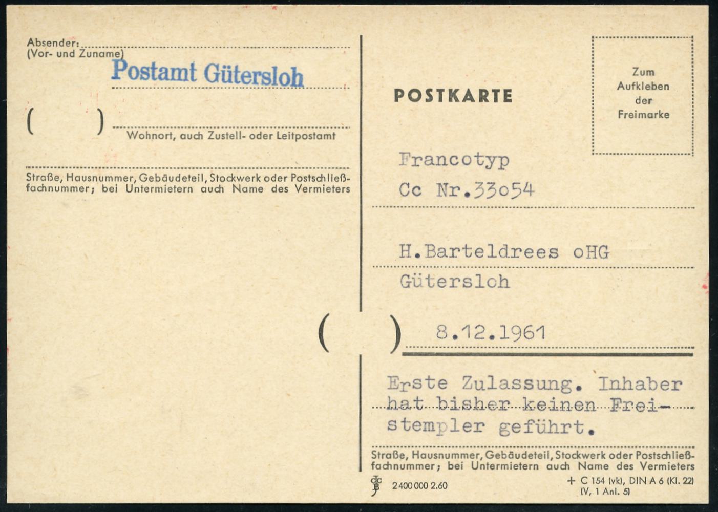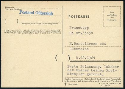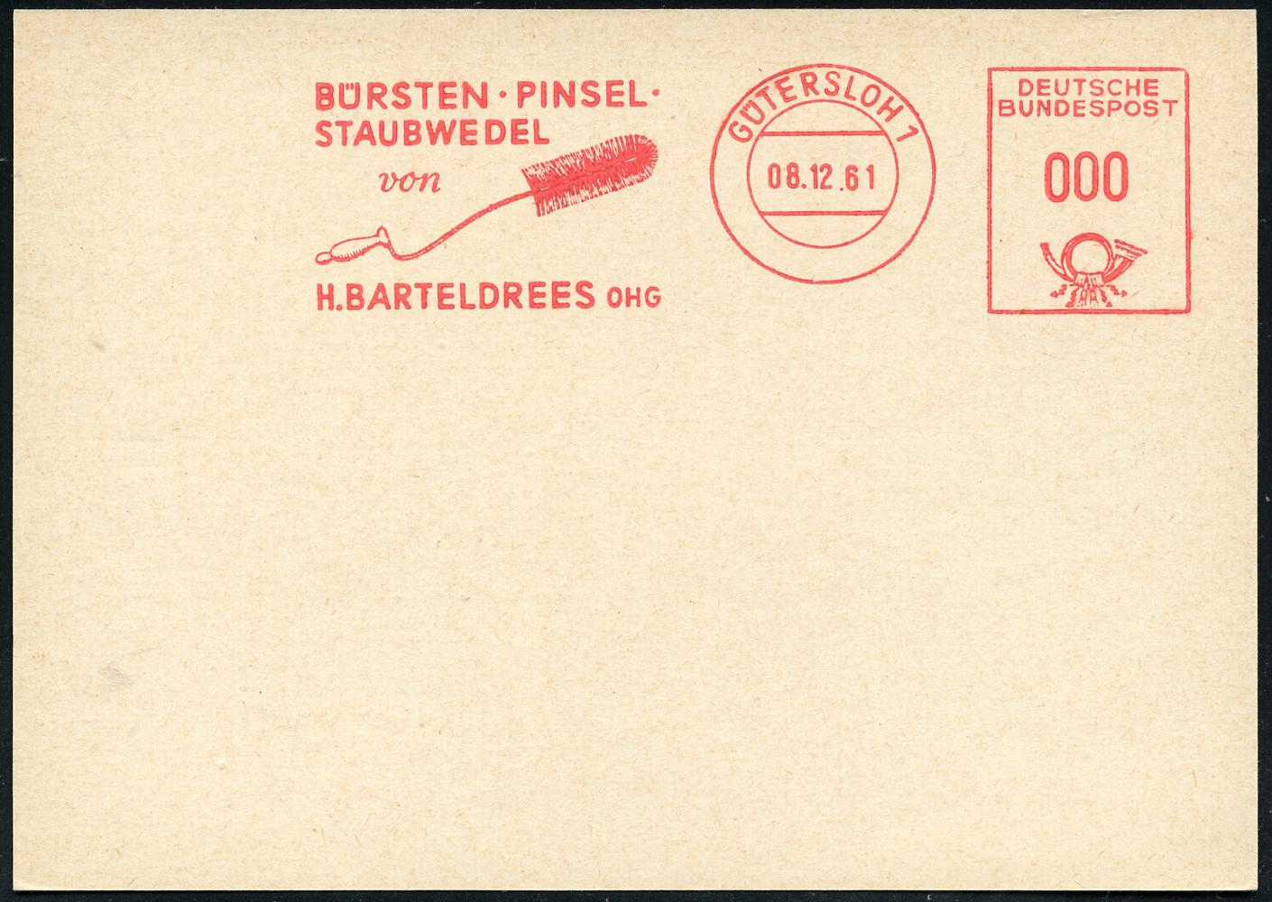 8644 | 20 € | PL-Raum 48.. (ohne Bielefeld) : GÜTERSLOH 1/ BÜRSTEN-PINSEL-/ STAUBWEDEL/ von/ H.BARTELDREES OHG 1961 (8.12.) AFS Francotyp "Posthorn" in 000 ohne PLZ (Spezialbürste) + rs. 1L: Postamt Gütersloh + div. Maschinendaten Francotyp klar gest. OPD-Archivkarte!, Unikat !, vergl. Kat.-Nr. 8647 (Dü.E-26 ohne PLZ) | ![]() ![]() | |