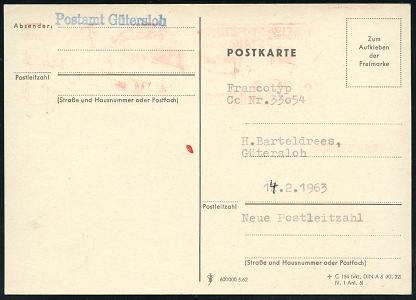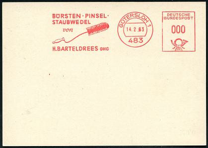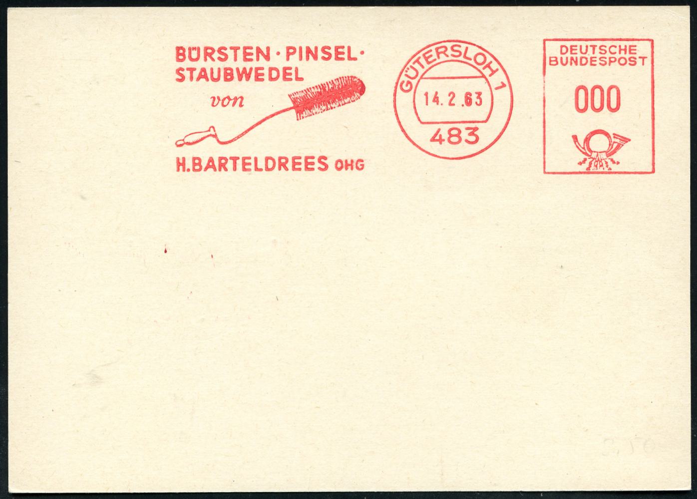 8647 | 20 € | PL-Raum 48.. (ohne Bielefeld) : 483 GÜTERSLOH 1/ BÜRSTEN-PINSEL-/ STAUBWEDEL/ von/ H.BARTELDREES OHG 1963 (14.2.) AFS-Musterabdruck Francotyp in 000 (Bürste) auf OPD-Archivkarte., rs. bl. 1L: Postamt Gütersloh + div. techn. Daten = Unikat !, vergl. Kat.-Nr.8644 (Dü.E-26) | ![]() ![]() | |