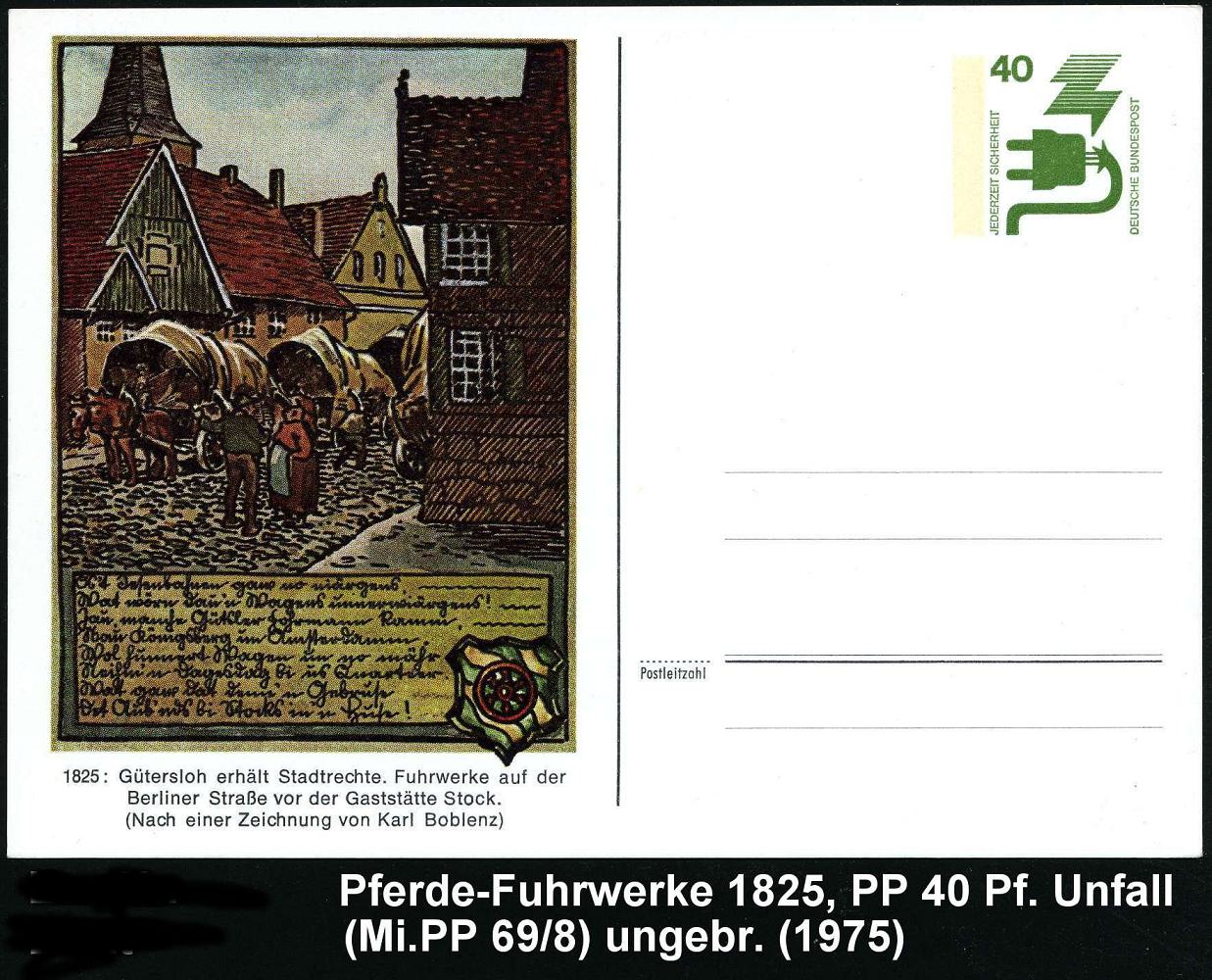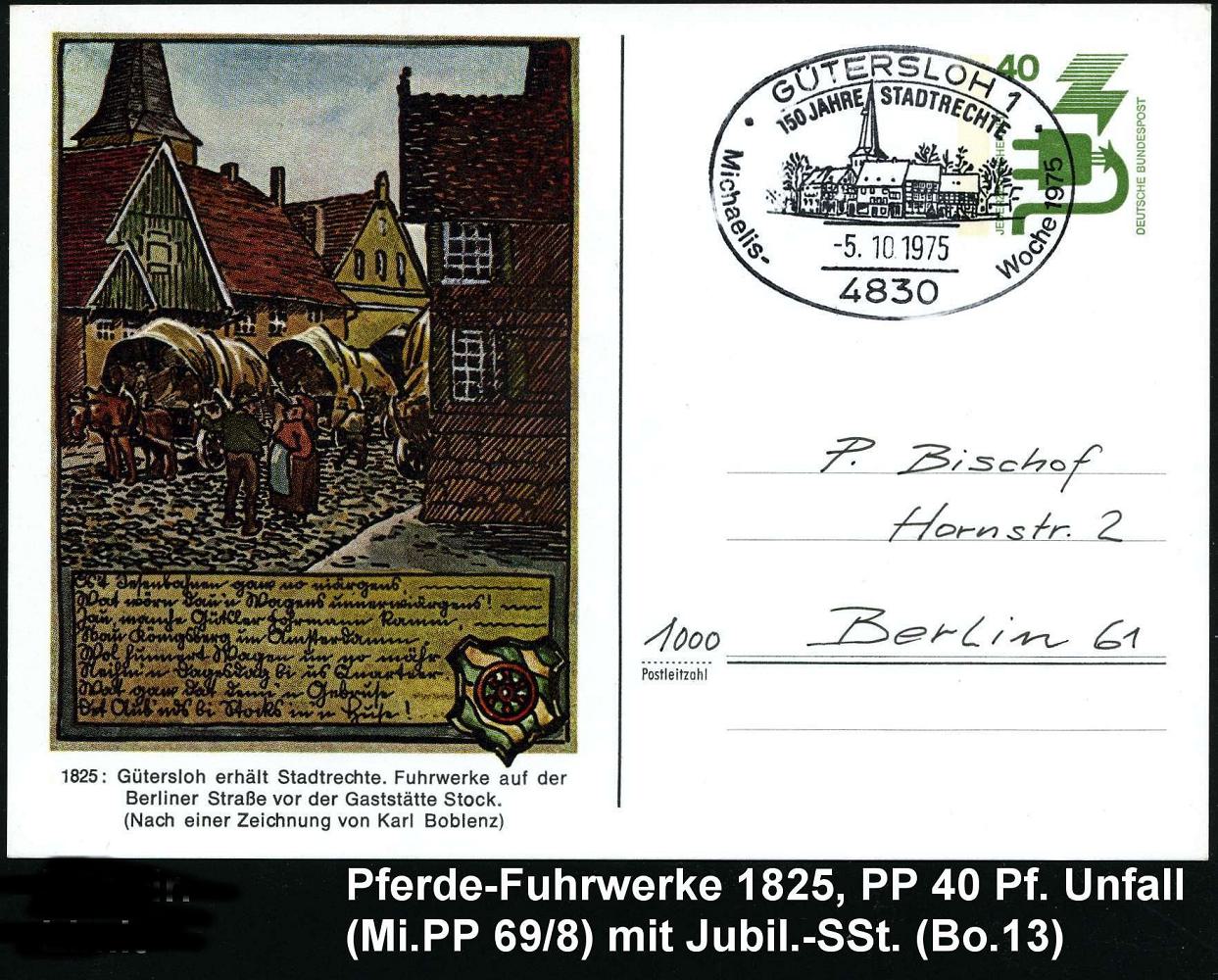 8654 | 12 € | PL-Raum 48.. (ohne Bielefeld) : 4830 GÜTERSLOH 1/ 150 JAHRE STADTRECHTE.. 1975 (5.10.) SSt (Ortsbild) auf passender PP 40 Pf: historische Pferde-Fuhrwerke v.1825 (Mi.PP 69/8) | ![]() | |