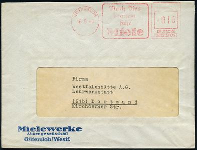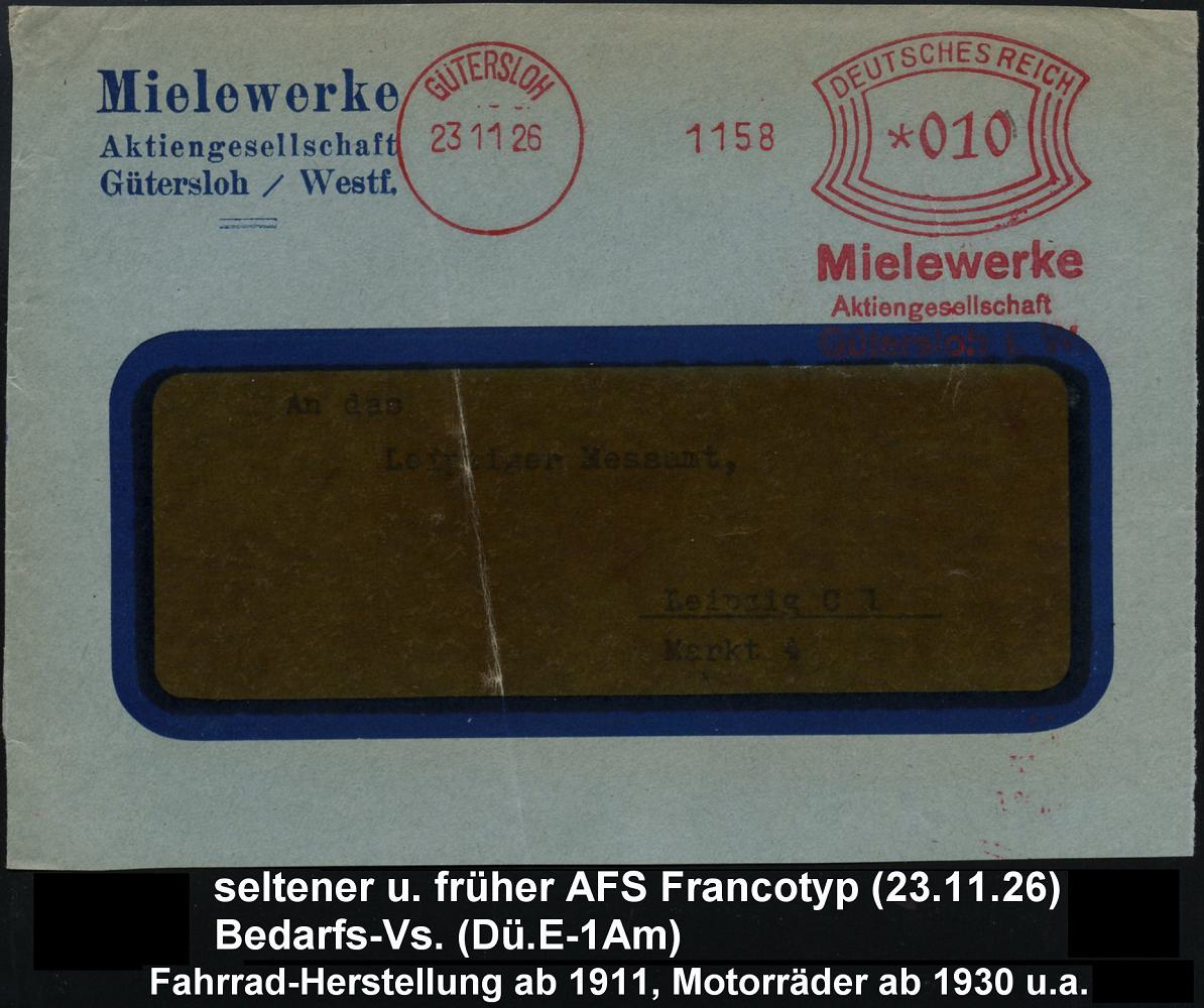 8627 | 15 € | PL-Raum 48.. (ohne Bielefeld) : GÜTERSLOH/ Mielewerke/ AG 1926 (23.11.) AFS Francotyp "Bogenrechteck" auf Firmen-Vorderseite = Hersteller von Kühlschränken, Waschmaschinen u.ä. (Dü.E-1Am) | ![]() | |