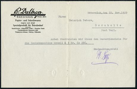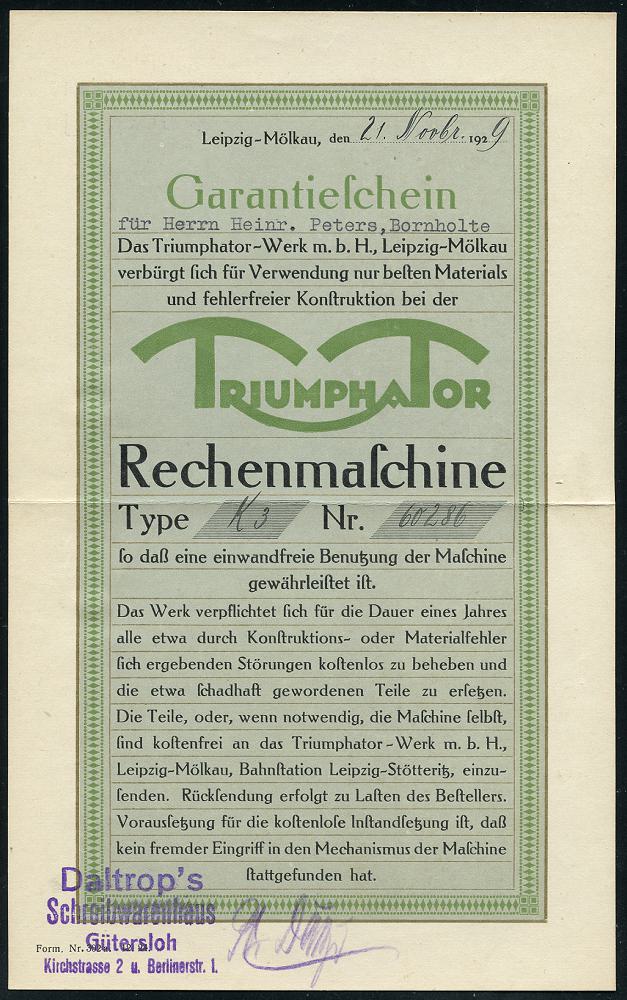 8628 | 35 € | PL-Raum 48.. (ohne Bielefeld) : GÜTERSLOH/ Älteste u.größte Industrie/ Westfälische/ Wurstwaren 1929 (22.11.) HWSt auf Firmen-Bf.: B. Daltrop, Spezialgeschäft für Bürobedarf.. + Inhalt: Firmen-Briefbogen + zweifarbiger Garantieschein für eine "TRIUMPHATOR" Rechenmaschine.., 3 Belege kompl.! (Bo.1, nur 1929-30 verwendet) | ![]() ![]() ![]() | |