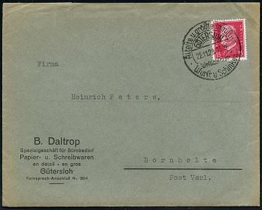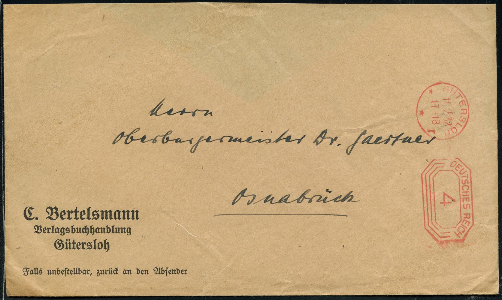 8629 | 12 € | PL-Raum 48.. (ohne Bielefeld) : GÜTERSLOH/ **I/ DEUTSCHES REICH 1932 (11.2.) PFS "Achteck" 4 Pf. auf Firmen-Bf.: C. Bertelsmann Verlagsbuchhandlung.. (Dü.D-4) | ![]() | |