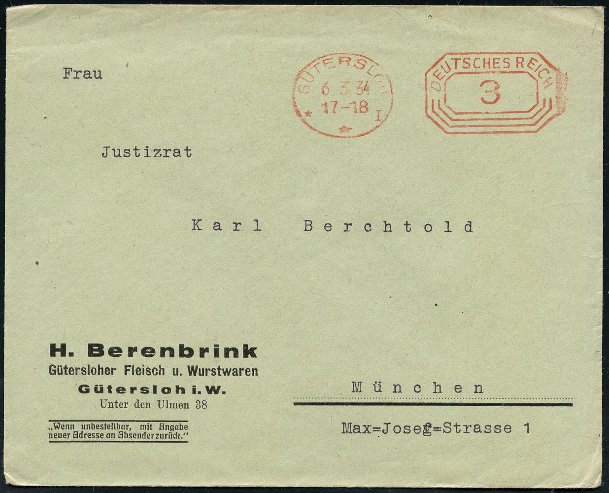 8630 | 10 € | PL-Raum 48.. (ohne Bielefeld) : GÜTERSLOH/ **I/ DEUTSCHES REICH 1934 (6.3.) PFS "Achteck" 3 Pf. auf Firmen-Bf.: H. Berenbrink, Gütersloher Fleisch- u. Wurstwaren.. (rs. fehlt Klappe) n. München (Dü.D-4) | ![]() | |