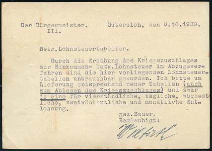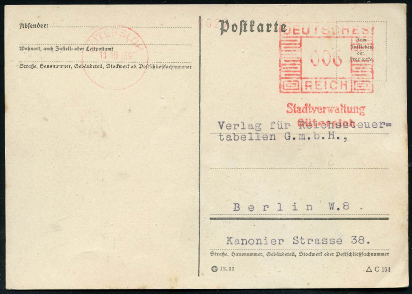 8631 | 20 € | PL-Raum 48.. (ohne Bielefeld) : GÜTERSLOH/ Stadtverwaltung.. 1939 (10.11.) AFS Francotyp "Mäanderrechteck" (kriegsbedingt etw. schwach) Fern-Kt. n. Berlin, rs. Text zu "Kriegszuschlag" (Dü.E-2CEh) | ![]() ![]() | |