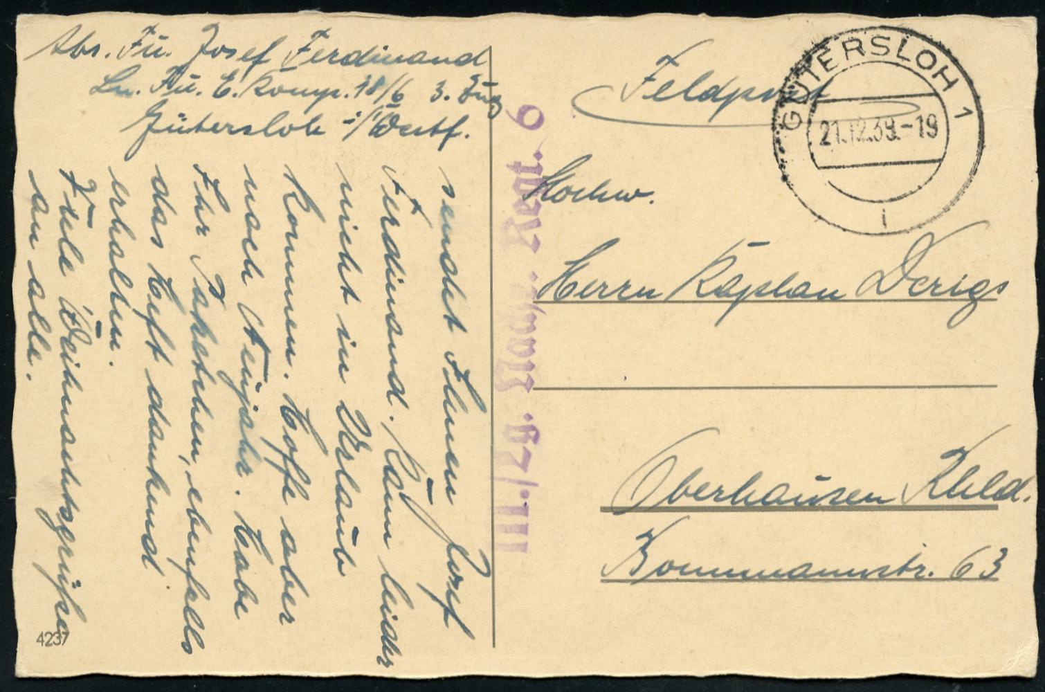 8632 | 15 € | PL-Raum 48.. (ohne Bielefeld) : GÜTERSLOH 1/ i 1939 (21.12.) 2K-Steg + viol. Abs.-1L: III./Zg. Nachr.(ichten) Regt. 6 + hs. Abs. = Luftwaffe! , Weihnachts-Feldpost-Ak. n. Oberhausen | ![]() ![]() | |