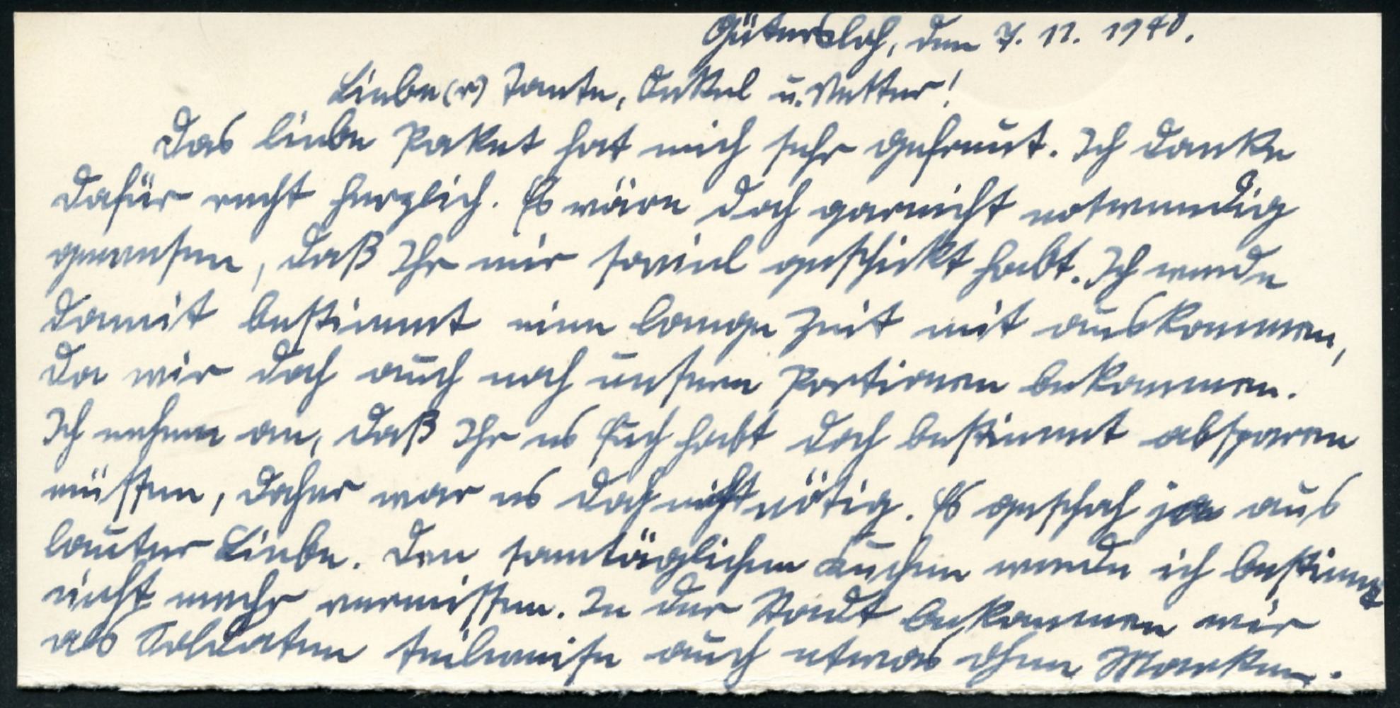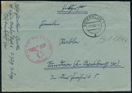8633 | 14 € | PL-Raum 48.. (ohne Bielefeld) : GÜTERSLOH 1/ c 1940 (7.11.) 2K-Steg + roter 1K-HdN: 18./Lg. Nachr.Regt. 6 Gütersloh + hs. Abs. = Luftwaffe! , Feldpost-Bf. (2x Öffnungsriß) + Inhalt!, 2 Belege kompl. | ![]() ![]() | |