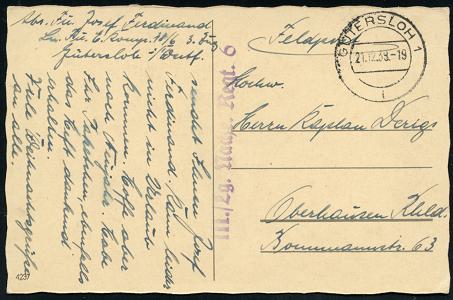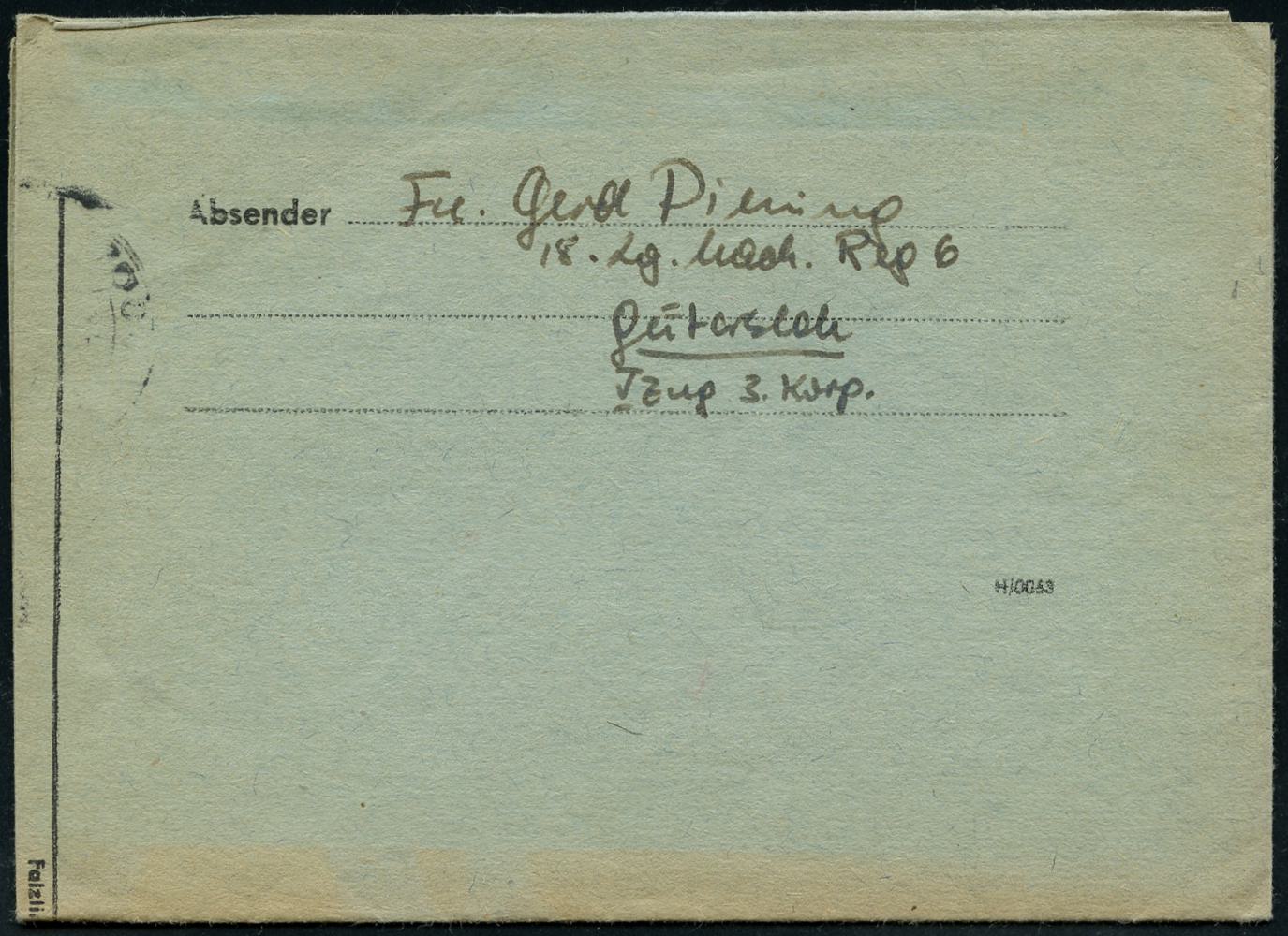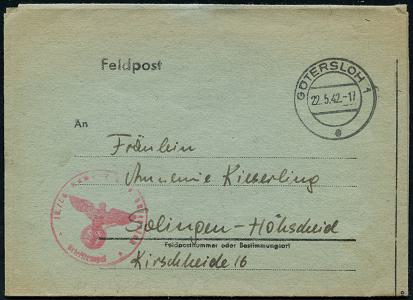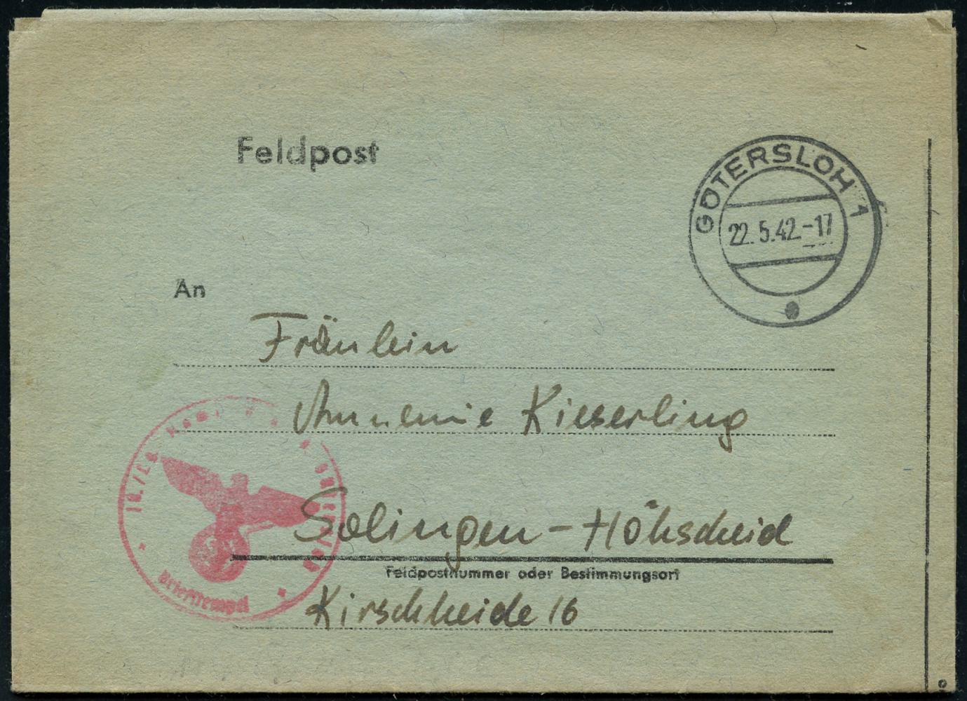 8634 | 15 € | PL-Raum 48.. (ohne Bielefeld) : GÜTERSLOH 1/ c 1942 (27.5.) 1K-Steg + roter 1K-HdN: 18./ Lg. Nachr. Regt. 6 Gütersloh + rs. hs. Abs. = Luftwaffe , Feldpost-Falt-Bf. mit Inhalt n. Solingen | ![]() ![]() | |