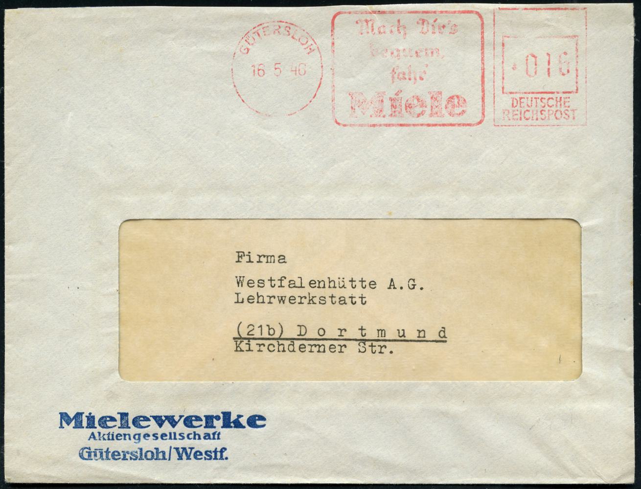 8637 | 25 € | PL-Raum 48.. (ohne Bielefeld) : GÜTERSLOH/ Mach Dir´s/ bequem/ fahr/ Miele 1946 (16.5.) aptierter AFS Francotyp "Reichsadler ANTIQA" = entfernt = Notmaßnahme! , Fiirmen-Fern-Bf. = Hersteller von Fahrrädern (ab 1911), Motorräder (ab 1930), Kühlschränken u. Waschmaschinen etc. (Dü.E-14 C-231o) | ![]() | |