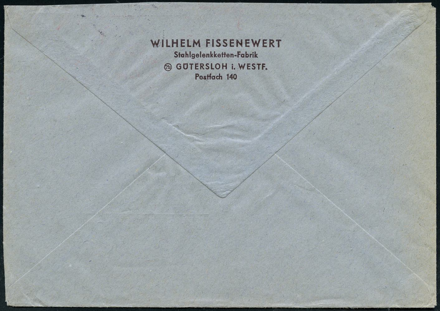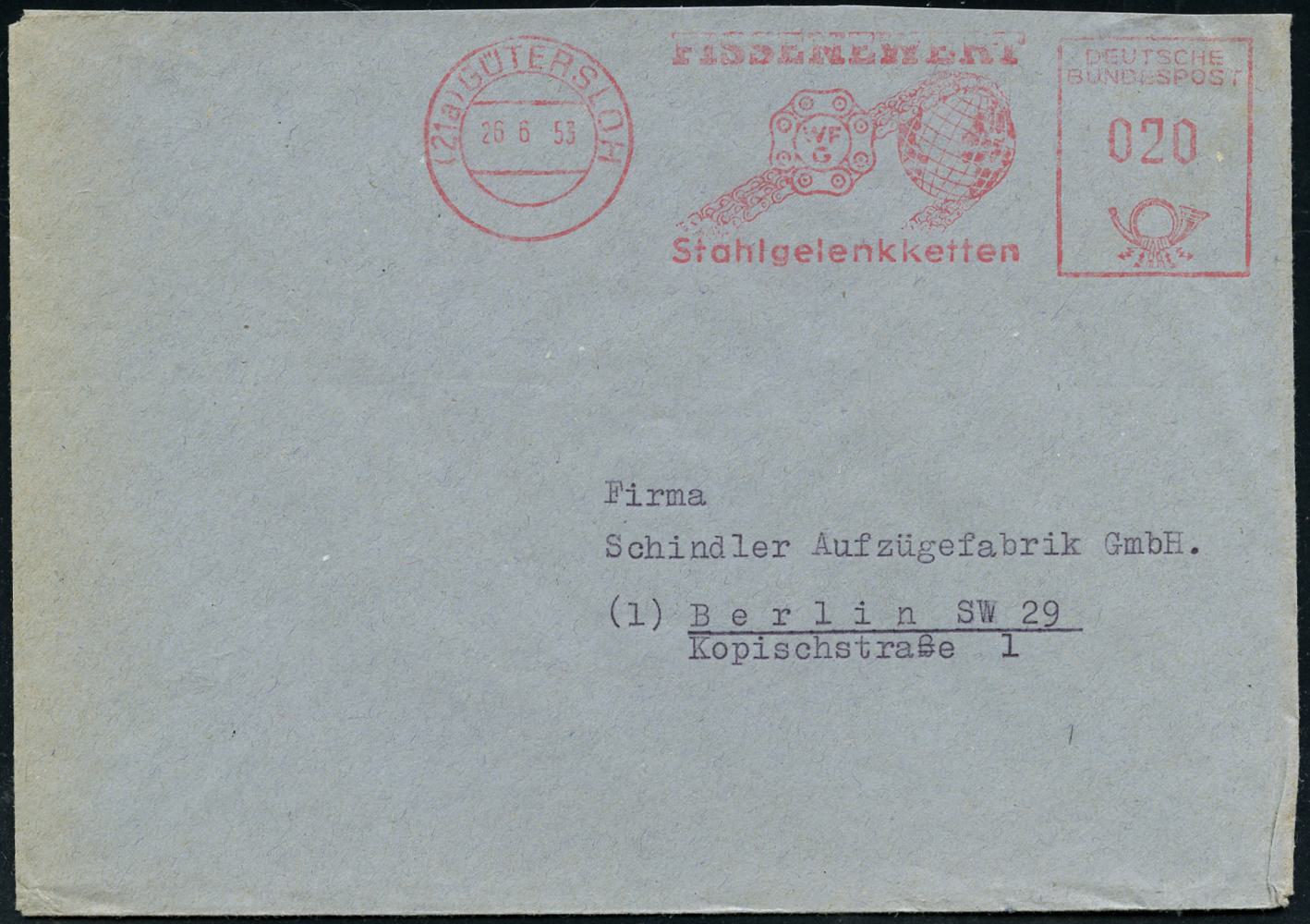 8640 | 16 € | PL-Raum 48.. (ohne Bielefeld) : (21a) GÜTERSLOH / FISSENWERT/ Stahlgelenkketten 1953 (26.6.) AFS Francotyp "Posthorn" (Firmen-Logo mit Fahrrad-Kette u. Globus) rs. Abs.-Vordruck, Fern-Bf., seltenes Motiv! (Dü-E-23CG) | ![]() ![]() | |