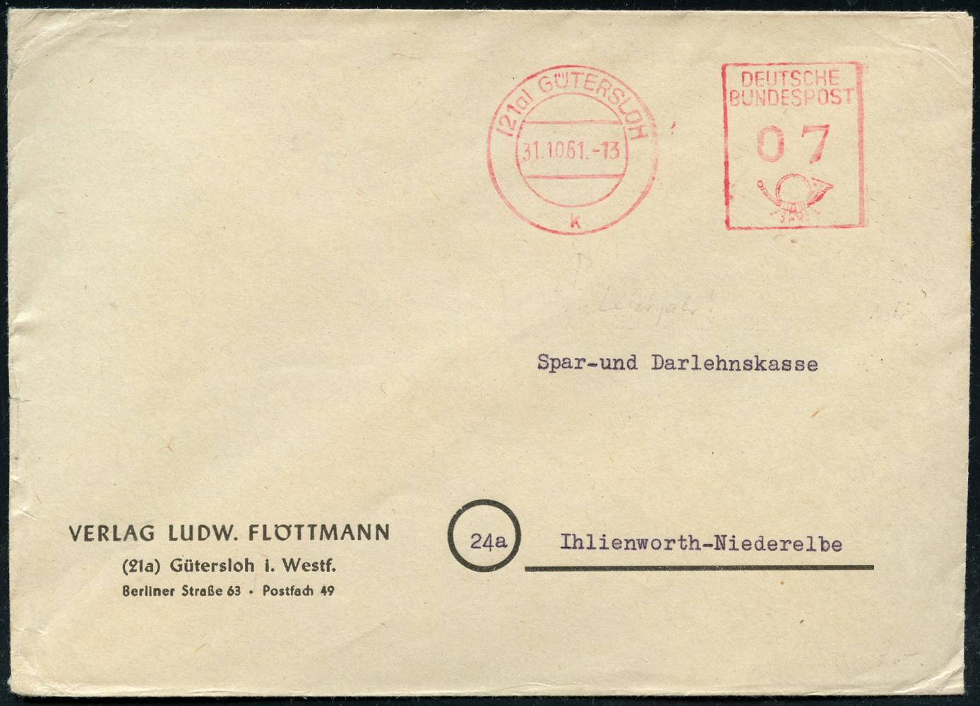 8643 | 8 € | PL-Raum 48.. (ohne Bielefeld) : (21a) GÜTERSLOH/ k/ DEUTSCHE/ BUNDESPOST 1961 (31.10.) PFS Hochrechteck "Posthorn" auf Firmen-Bf.: VERLAG LUDW. FLÖTTMANN.. (Dü.D-17 = Letztjahr alte PLGZ) | ![]() | |
