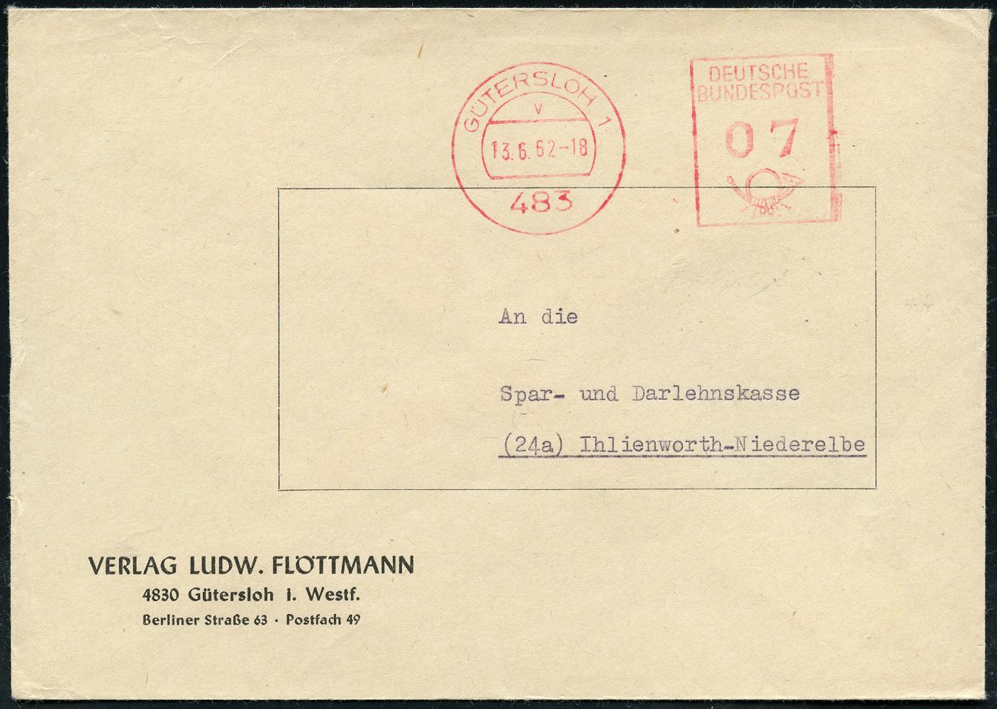 8646 | 12 € | PL-Raum 48.. (ohne Bielefeld) : 483 GÜTERSLOH/ BERTELSMANN.. 1962 (17.10.) AFS Francotyp, Sonderform 1K-OrtsStpl. mit kleinr PLZ (nur bei D-Maschinen!) Teil-Bf. (Dü.E-23D = Sonderform OrtsStpl.) | ![]() | |