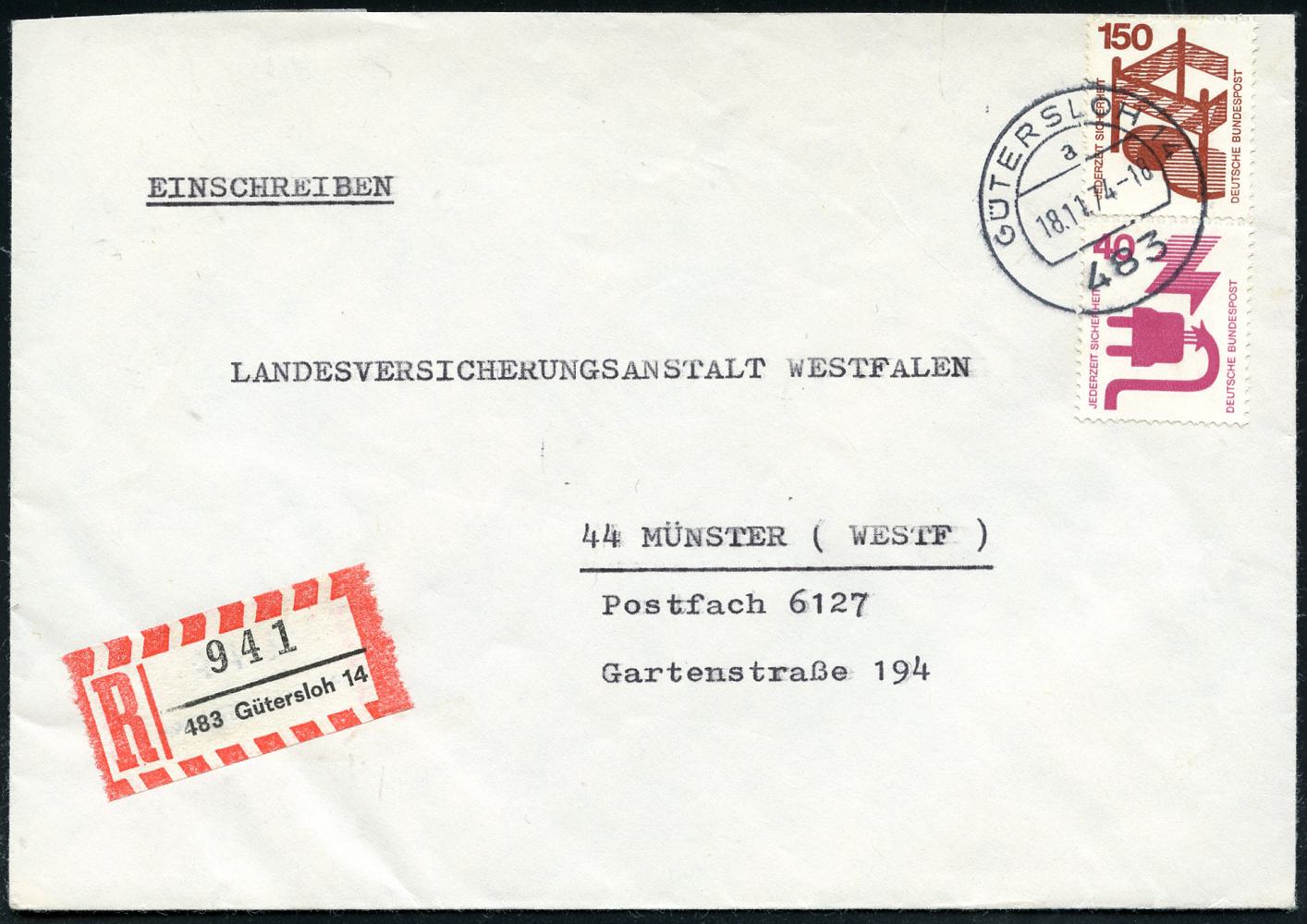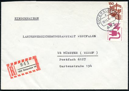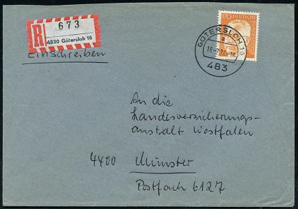 8652 | 10 € | PL-Raum 48.. (ohne Bielefeld) : 483 GÜTERSLOH 14/ a 1974 (18.11.) 1K-Stegment auf 40 Pf. + 150 Pf. Unfall, satzreine Frankatur + RZ: 483 Gütersloh 14 (Bf. rs. Klappenfehler) klar gest. Inl.-R-Bf. | ![]() | |