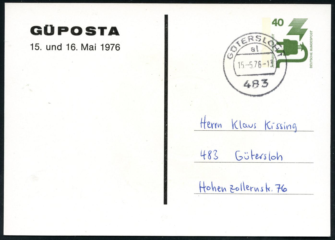 8655 | 10 € | PL-Raum 48.. (ohne Bielefeld) : 483 GÜTERSLOH 1/ al 1976 (15.5.) 1K-Segment auf PP 40 Pf. Unfall, grün: GÜPOSTA:: Das Wappen der Stadt.. (Stadtwappen) Inl.-Karte | ![]() ![]() | |