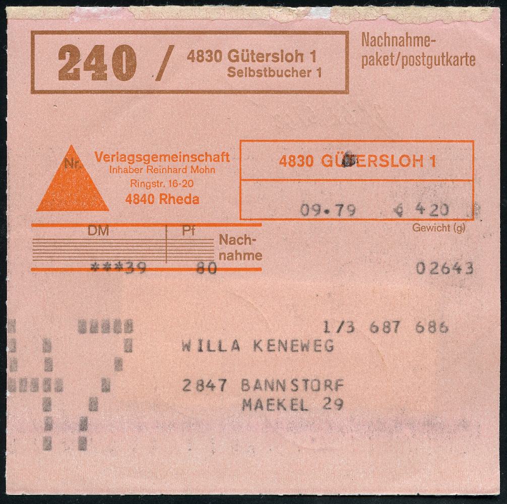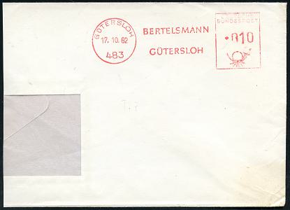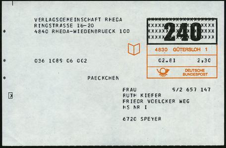 8657 | 10 € | PL-Raum 48.. (ohne Bielefeld) : 4830 GÜTERSLOH 1 1981 (Feb.) EDV-Freistempel mit Buchsymbol = Bertelsmann, Feld orange, altes Posthorn, schw. EDV-Wertangabe 2,30 (DM) Adreßlabel PAECKCHEN "Verlagsgesellschaft Rheda" n. Speyer (Dü.J-2, Nr.3) | ![]() | |