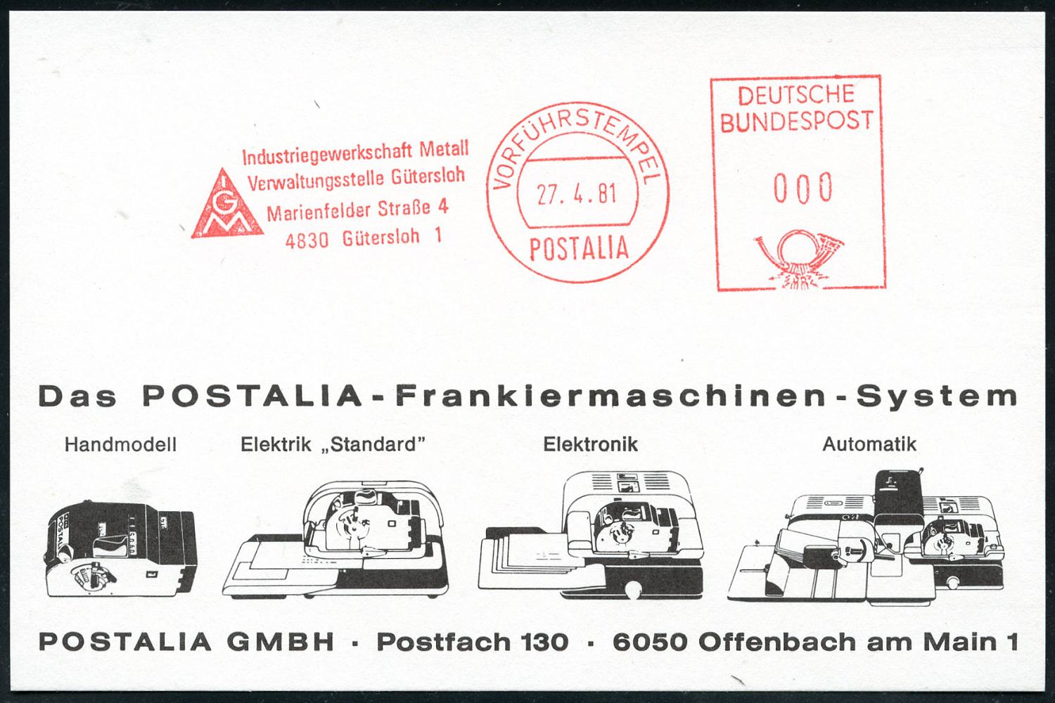 8658 | 18 € | PL-Raum 48.. (ohne Bielefeld) : 4830 Gütersloh 1 1981 (27.4.) AFS.: VORFÜHRSTEMPEL/POSTALIA/Industriegewerkschaft Metall.. IGM (Logo) seltene Postalia-Muster-Kt. (= Specimen) | ![]() | |