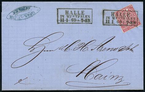 8660 | 25 € | PL-Raum 48.. (ohne Bielefeld) : HALLE/ IN WESTFALEN/ * 1969 (11.1.) nachverwendeter, preuß. Ra.3 (Feu.1360) 2x klar auf EF NDP 1 Gr. , Fernbf. n. Mainz, rs. AS. (Mi.4 EF) | ![]() ![]() | |