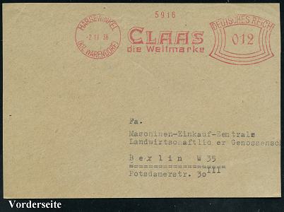 8662 | 15 € | PL-Raum 48.. (ohne Bielefeld) : HARSEWINKEL/ (KR.WARENDORF)/ CLAAS/ die Weltmarke 1936 (2.11.) AFS Francotyp "Bogenrechteck" auf Bedarfs-Vorderseite = Maschinenfabrik, vergl. Kat.-Nr.8663 (Dü.E-1CEh) | ![]() | |