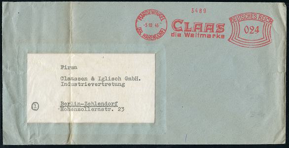 8663 | 25 € | PL-Raum 48.. (ohne Bielefeld) : HARSEWINKEL/ (KR.WARENDORF)/ CLAAS/ die Weltmarke 1946 (5.10.) AFS Francotyp "Bogenrechteck" unverändert mit Inschrift "DEUTSCHES REICH" weiterverwendet = Notmaßnahme! , rs. Abs.-Ra.3 (Bf. links gefaltet) klar gest. Fern-Bf. (Dü.E-1CEh, unverändert) | ![]() | |