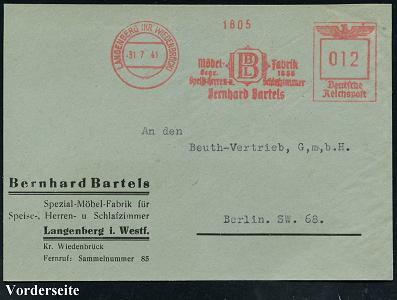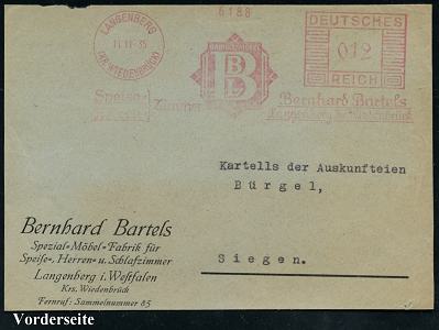 8665 | 28 € | PL-Raum 48.. (ohne Bielefeld) : LANGENBERG/ (KR WIEDENBRÜCK)/ BBL/ ..Bernhard Bartels.. 1935/41 AFS Francotyp "Mäanerrechteck" bzw. "Reichsadler" (je Monogr.-Logo) = Spezialmöbel-Fabrik für Speise-, Herren- u. Schlafzimmer, je auf Firmen-Vorderseite (Einzelverkauf möglich: je 15.- EUR) 2 Belege (Dü.E-2CEh, E-5CGh) | ![]() ![]() | |