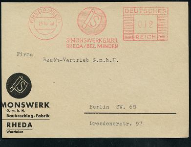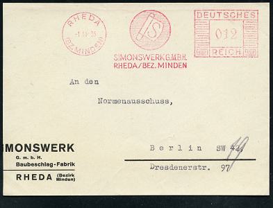 8669 | 25 € | PL-Raum 48.. (ohne Bielefeld) : RHEDA/ (BZ.MINDEN)/ SIMONSWERK GMBH.. 1935/39 2 verschiedene AFS "Mäanderrechteck" mit verschiedenen Orts-Stempel (1K bzw. 2K-Steg) je Teil-Vorderseite: SIMONSWERK.. Baubeschlag-Fabrik (Einzelverkauf möglich: je 14.- EUR) 2 Belege (Dü.E-2CE) | ![]() ![]() | |