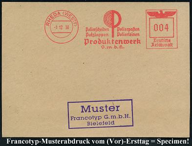 8670 | 35 € | PL-Raum 48.. (ohne Bielefeld) : RHEDA (WESTF)/ Polierscheiben Polierpasten../ Produktenwerk/ GmbH 1938 (1.12.) AFS-Musterabdruck Francotyp "Reichsadler" (Firmen-Logo) glasklar gest. Francotyp-Musterblatt vom (Vor)-Ersttag !, selten! (Dü.E-5CGo) | ![]() ![]() | |