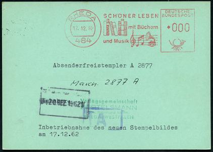 8671 | 20 € | PL-Raum 48.. (ohne Bielefeld) : 484 RHEDA/ SCHÖNER LEBEN/ mit Büchern/ u.Musik 1962 (12.12.) AFS Francotyp "Posthorn" in 000 (Bücher, Noten, Grammophon) OPD-Archiv-Kt. mit posttechn. Daten = Fa. Bertelsmann, seltenes Archiv-Unikat! (Dü.E-23DO) | ![]() | |