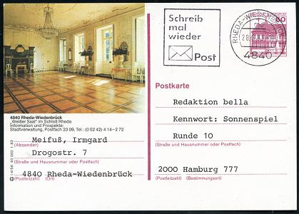 8673 | 14 € | PL-Raum 48.. (ohne Bielefeld) : 4840 RHEDA-WIEDENBRÜCK 1/ md/ Schreib/ mal/ wieder.. 1983 (28.6.) MWSt auf ortsgleicher BiP 60 Pf. Burgen: 4840 Rheda-Wiedenbrück, "Weißer Saal" in Schloß Rheda.. (Mi.P 138-i 4/56) Bedarf, seltene Kombination! | ![]() | |