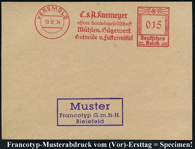 8678 | 35 € | PL-Raum 48.. (ohne Bielefeld) : VERSMOLD/ C.& A.Knemeyer/ ..Mühlen,Sägewerk/ Getreide u.Futtermittel 1934 (13.12.) AFS-Musterabdruck Francotyp "Hakenkreuz" , glasklar gest. Francotyp-Musterblatt vom (Vor)-Ersttag !, selten! (Dü.E-3CEo) | ![]() ![]() | |
