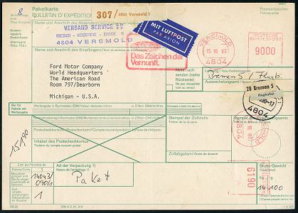 8683 | 25 € | PL-Raum 48.. (ohne Bielefeld) : 4804 VERSMOLD/ Ford/ Das Zeichen der/ Vernunft 1980 (15.10.) AFS Francotyp 9000 Pf. + 6190 Pf. = 2 Abdrucke! + brauner Paketzettel: 4804 Versmold 1 + Leitzettel: 28 Bremen 5, Übersee-Flp.-Paket-Kt. (schwache Falte u. kl. Klammerspur) n. U.S.A., sehr seltene Portostufe! (Dü.E-26) | ![]() | |